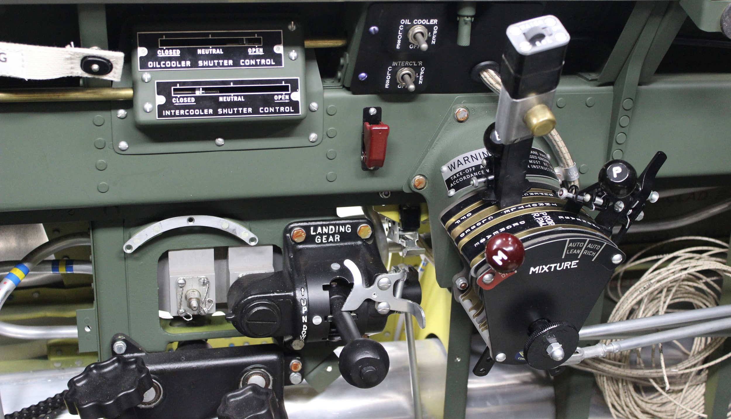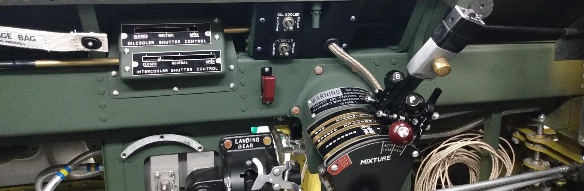 This left side view of the cockpit shows the throttle quadrant. The two switches are for the oil cooler (upper) and intercooler (lower). The box to the left of the switches is the indicator for the oil cooler and intercooler shutters. (photo via AirCorps Aviation)