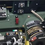 The landing gear control is in the center of this photo. The bare aluminum linkage touching the landing gear lever is the landing gear lock out assembly which prevents what would be a very bad day caused by accidental landing gear retraction on the ground. (photo via AirCorps Aviation)