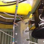The 4 pulleys are now in place in the pulley bracket depicted in the previous picture. The lower pulley pair is for aileron trim. The tube between the two routes to the left wing hard point for the drop tank. The right tube goes down to the fuselage hard point for the centerline drop tank. Both tubes lead up to the fuel selector valve.