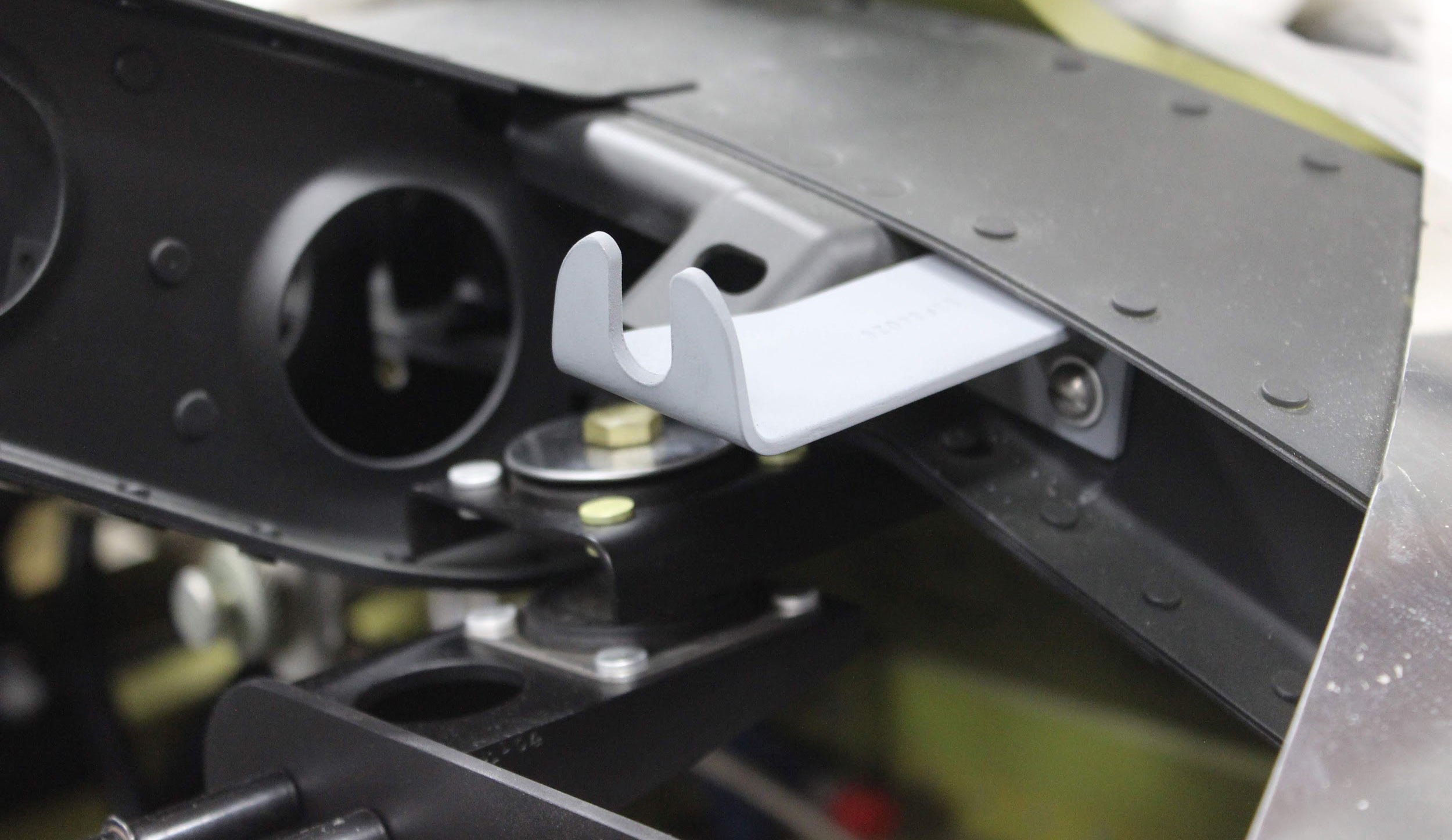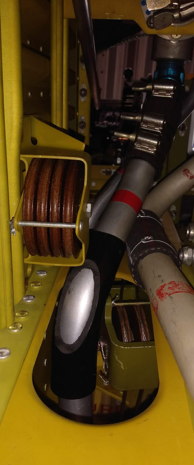 This bracket holds pulleys with cables that run to the wing hard points for the arming and release of the bombs or drop tanks. This bracket is original to 42-27609. (photo via AirCorps Aviation)