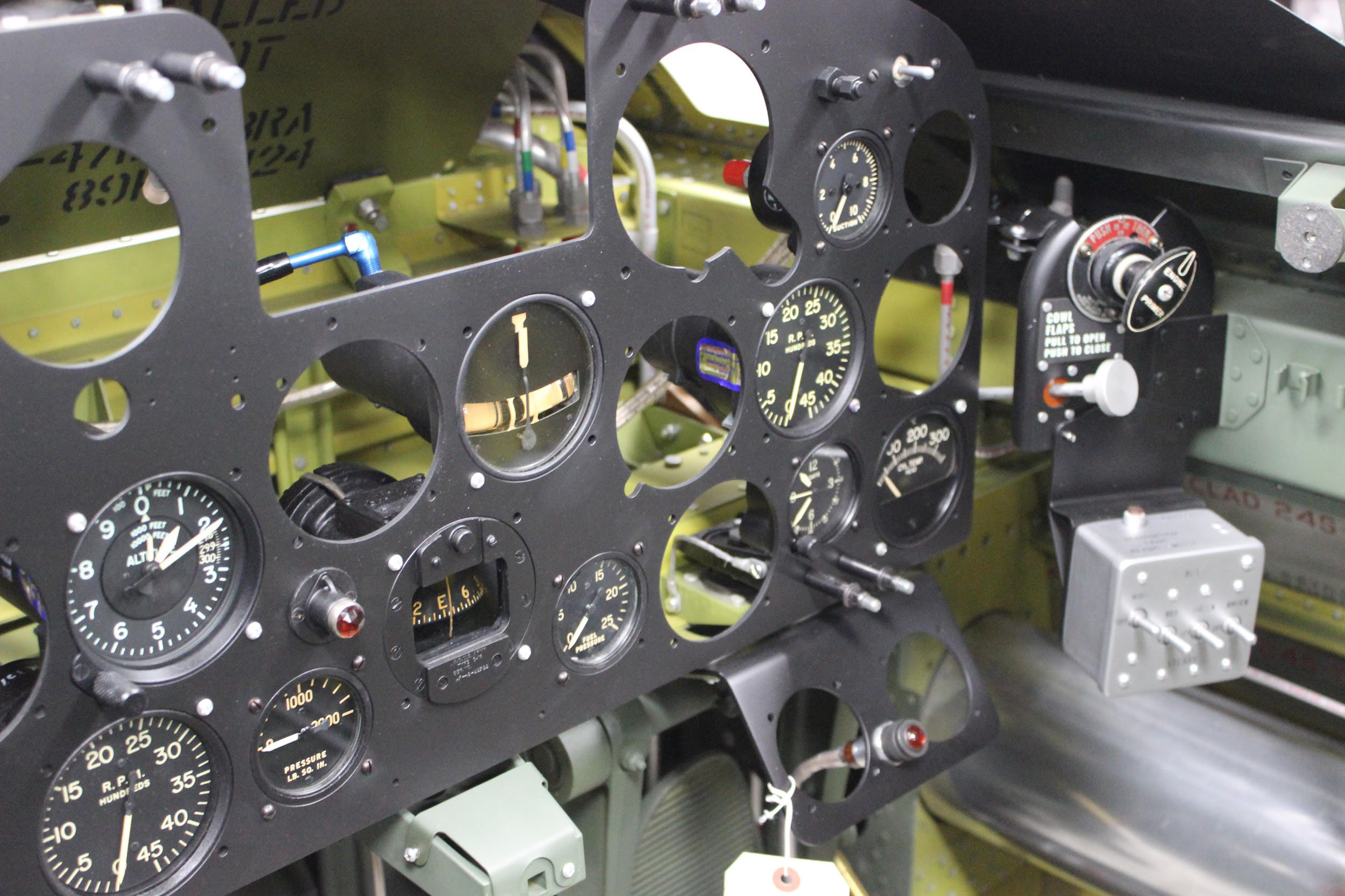 The lower right instrument panel showing the cowl flap control and the recognition light switch box, in the upper and mid center respectively. The sub panel with the orange light is where the oxygen gauges will live (pressure gauge and blinker). (photo via AirCorps Aviation)