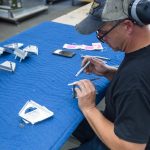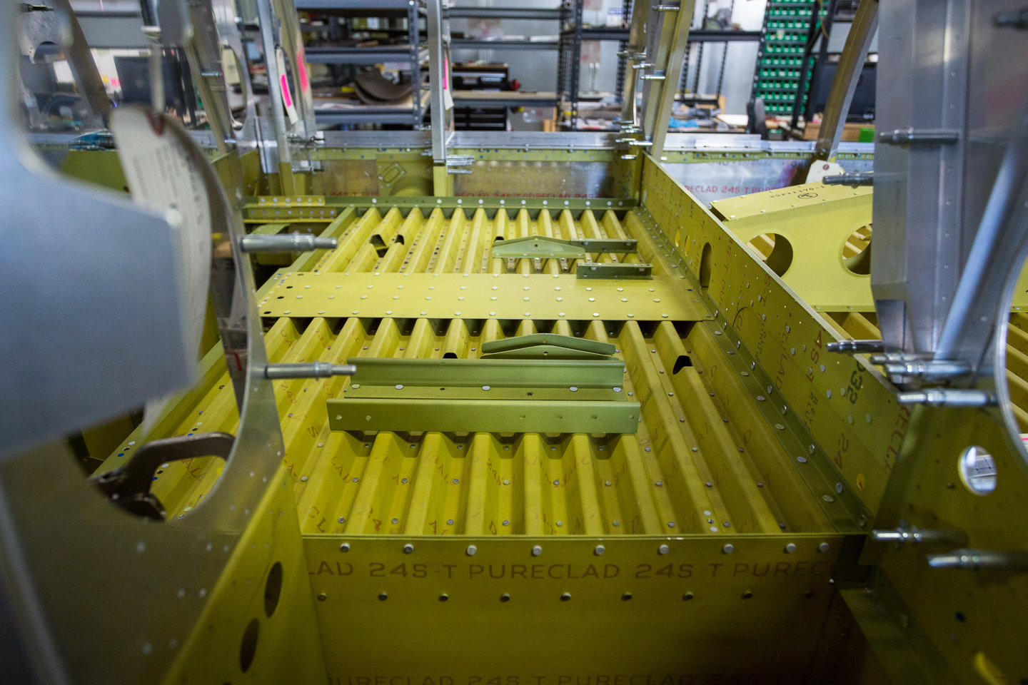 This is the bottom face of the forward fuselage tank bay panel. (photo by John LaTourelle)Aaron peers through the structure just behind the A-frame that makes up the forward bulkhead of the razorback section and provides rollover protection for the pilot. (photo by John LaTourelle)Aaron works in the cockpit area just forward of the rollover frame. (photo by John LaTourelle)A similar perspective of the rollover frame shows the fuselage crash protector fitting. The green tag indicates the fitting will be proven serviceable if it passes dye penetrant testing.. (photo by John LaTourelle)Chad works on an interior panel of the main fuel bay. (photo by John LaTourelle)This is the cockpit area and rear of the main fuel tank panel shown from slightly above. (photo by John LaTourelle)A side view of the same area with the protective pad removed lets us see the cockpit floor. (photo by John LaTourelle)From near the rear of the fuselage, we look forward at the turtledeck supporting structure and the rear face of the intercooler. (photo by John LaTourelle)The elevator lever support is clecoed in place between two fuselage formers. (photo by John LaTourelle)This image shows the elevator lever support looking forward toward the rollover A frame. (photo by John LaTourelle)Randy works in front of the the cockpit to fit and install an arch assembly at station 132 of the upper deck, forward fuselage. (photo by John LaTourelle)The instrument panel will be mounted to this former assembly as the restoration progresses. Sometimes it takes a great many clamps and clecos to hold a part tightly enough that rivet holes end up in the correct place and assure that the piece lays tight to the formers or structure beneath it. (photo by John LaTourelle)Work progresses on skinning the forward turtledeck. (photo by John LaTourelle)This shot gives a good perspective on how big this fighter really is – Aaron almost disappears inside the fuselage. It isn’t like working on a Mustang! (photo by John LaTourelle)The zinc chromated assembly inside the outer fuselage framework is the unique “ Christmas tree tank”. This was an innovation for the 5th Air Force to extend the P-47s range for long SW Pacific theater missions. (photo by John LaTourelle)The added zinc chromated tank is visible in about the middle of the top line of the fuselage. (photo by John LaTourelle)As assembly gets more detailed, the guys insert engineering drawings into handy spaces in the structure for quick reference. (photo by John LaTourelle)From the left: Dave, Ryan, Randy, and Aaron – The last three appear to be discussing the restorations progress. (photo by John LaTourelle)