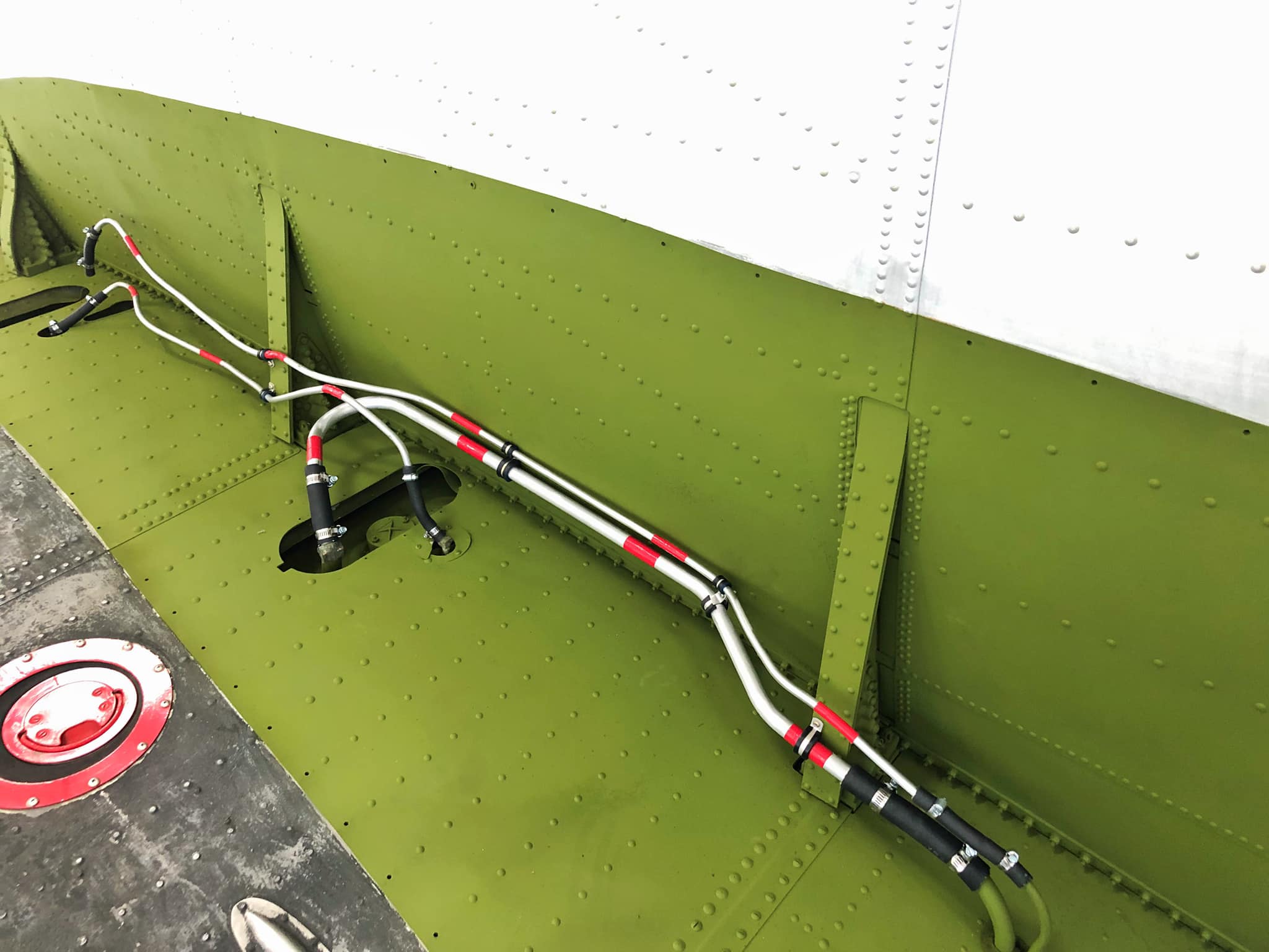Another task taking place has been the complete overhaul of all fluid lines in Beach City Baby. We have been replacing the earlier, much harder to find AC standard fittings with their AN standard equivalents. This has been a chore and a half, but Vintage Wings Inc. members, led by Joe Matz, have taken on this immense task with elan. The new lines make the airplane look brand new! Another difficult task has been the rebuild of Beach City Baby’s Airstair Door, which had seen better days. John Breitenbach dived head first into this difficult job, and he is now deep into the project restoring the door to better-than-new condition.