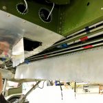Once the wing spar doublers were completed, our team began the task of stripping the aircraft of its faded corporate livery, taking the airframe down to bare metal and then treating the exposed surfaces with Alumi-prep and then Alodine conversion coating to protect the metal until repainting takes place. Through the help of Ward Lapaglia, an employee at PPG Aerospace, Vintage Wings received all paint remover, surface prep and paint from the Fortune 500 (US) aerospace giant.