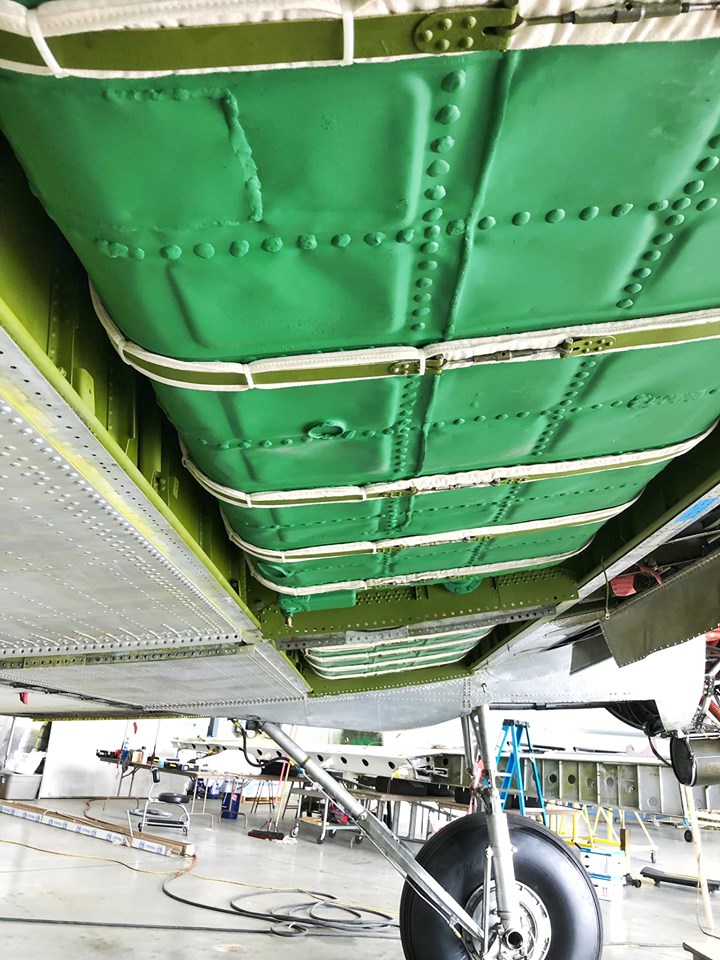 After a two-week break for the whole team, work commenced on the remaining hurdle in front of them. The C-53 needed to have her outer wing panels removed, the fuel tanks removed and doublers installed on the main spars as per the FAA-mandated AD. Along with this significant undertaking, the team also needed to replace and/or repair sections of aircraft skin, fluid lines, and various components and other parts which needed attention. They also needed to remove and replace all of the aircraft’s hardware, to complete the aircraft’s interior, not to mention continue their efforts to clean the aircraft, strip away old paint and finally repaint her into the same livery she wore back in 1942. This was a massive to-do list, to say the least, but the crew buckled down and got cracking!