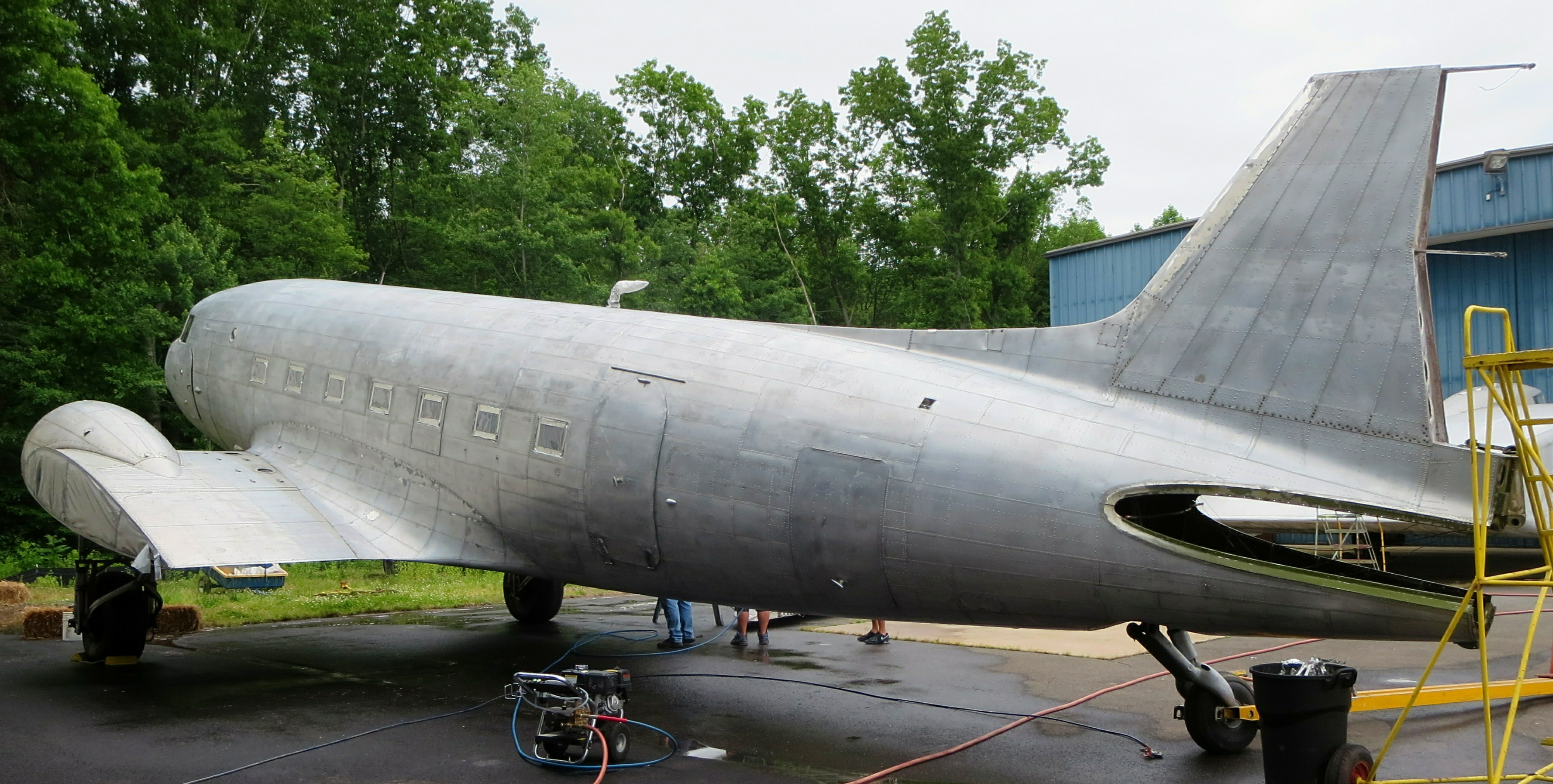 During the winter, museum volunteers moved the DC-3’s left wing into the heated restoration building to begin polishing its aluminum skin. They stood the wing in a cradle on its leading edge, and installed scaffolding around the wing to allow their volunteers to safely reach all of the surfaces for polishing. As you will see in the accompanying photographs, the results continue to be encouraging. This season’s winter weather was challenging for all Museum operations as several planned workdays had to be cancelled or shortened due to the harsh conditions. Even so, the underside wing surfaces were completely polished by mid-April. With the advent of warmer weather, the left wing returned to the storage building for the top-side polishing, and to recommence polishing the fuselage forward of the wing box connection point. Moving the wing back to the storage building freed up space in the restoration hangar again for NEAM’s other projects (including the Burnelli CBY-3 and Anson Johnson P-51D Mustang racer).