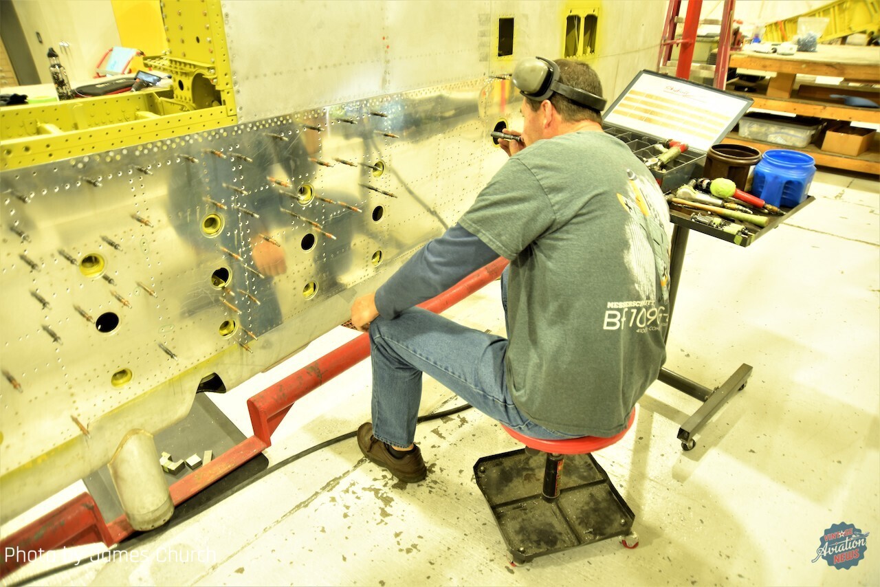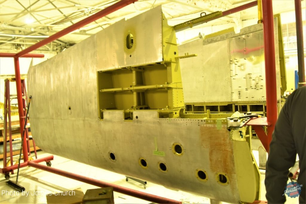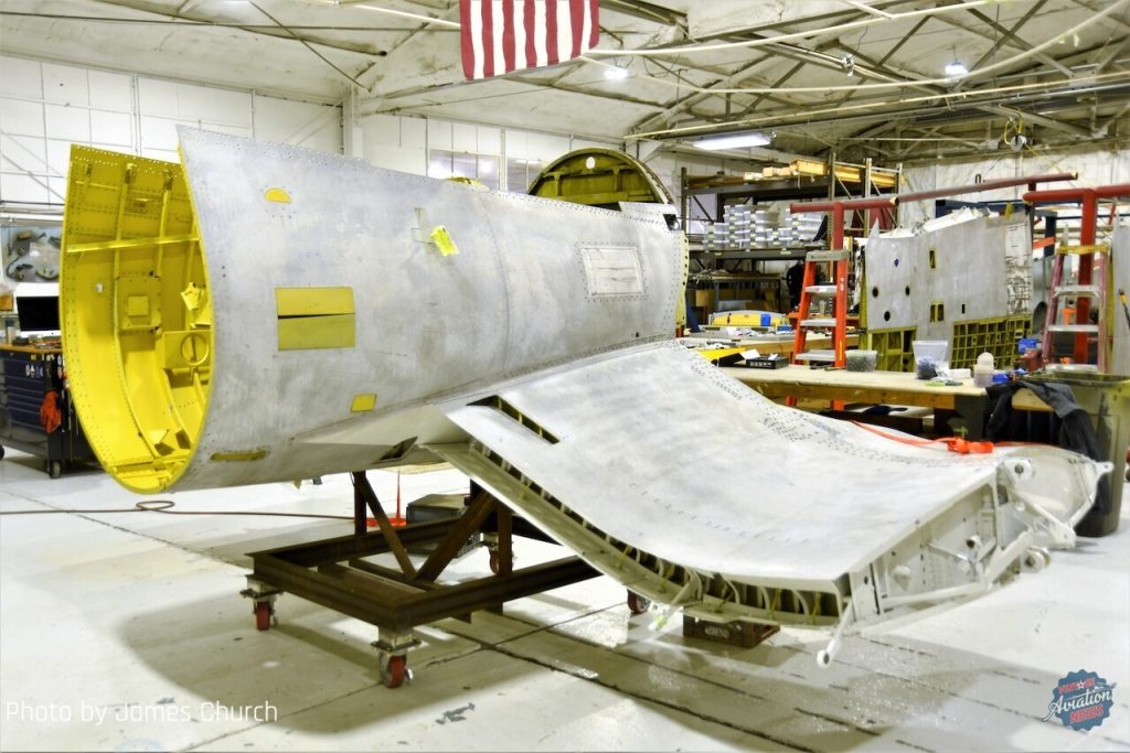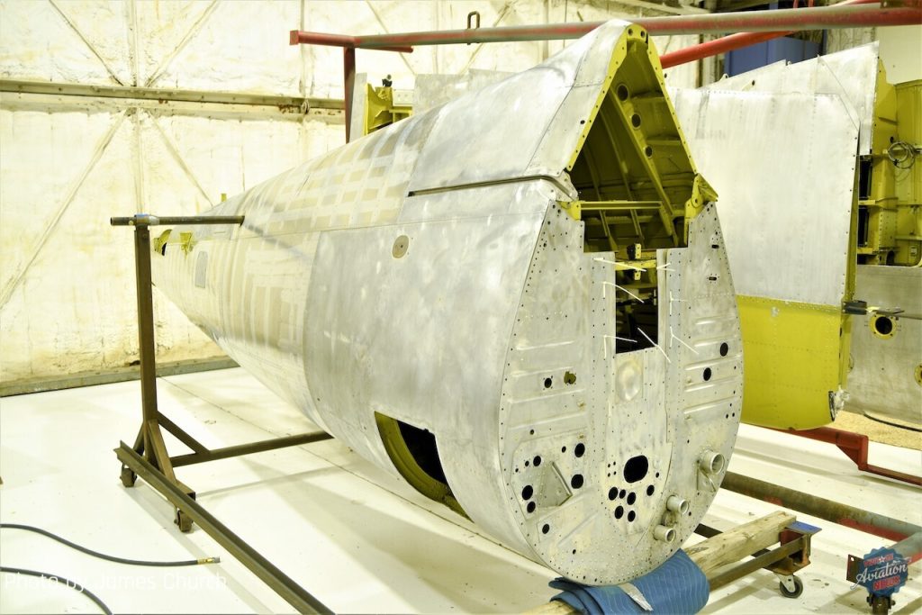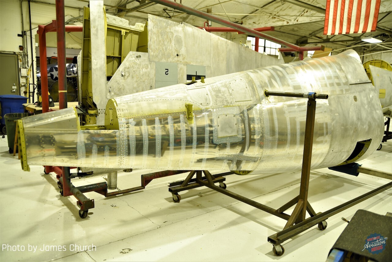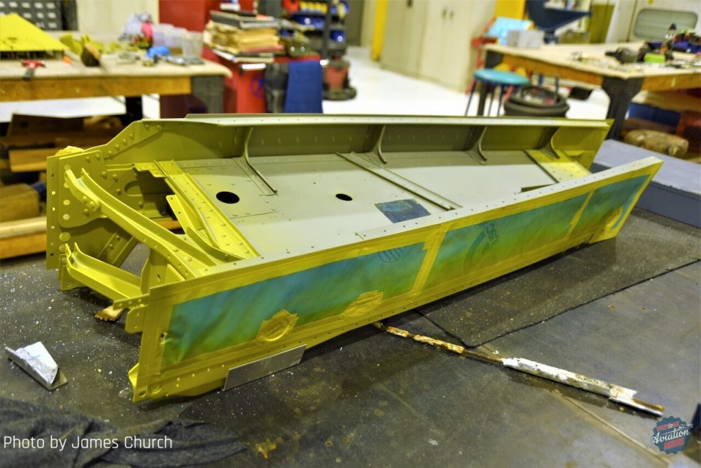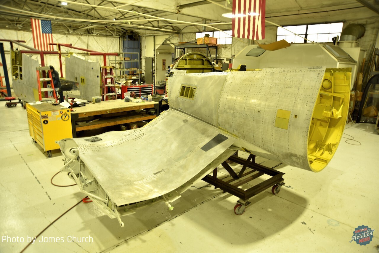 All of the major components are now with Midwest Aero, and while the brunt of the structural work has been completed, much further work, structural and otherwise remains to be done before the aircraft takes flight again. During our last visit, some wing skins were being riveted in place, while damage to the wheel wells and wing fold areas were also being addressed. At this point, while moving further on the rebuilding and repairing of the airframe, things are still very much in the stage of assessing what remains to be done and formulating a plan of attack to complete the aircraft. With this in mind, no timeframe has been offered for the as-yet projected completion and return to flight.