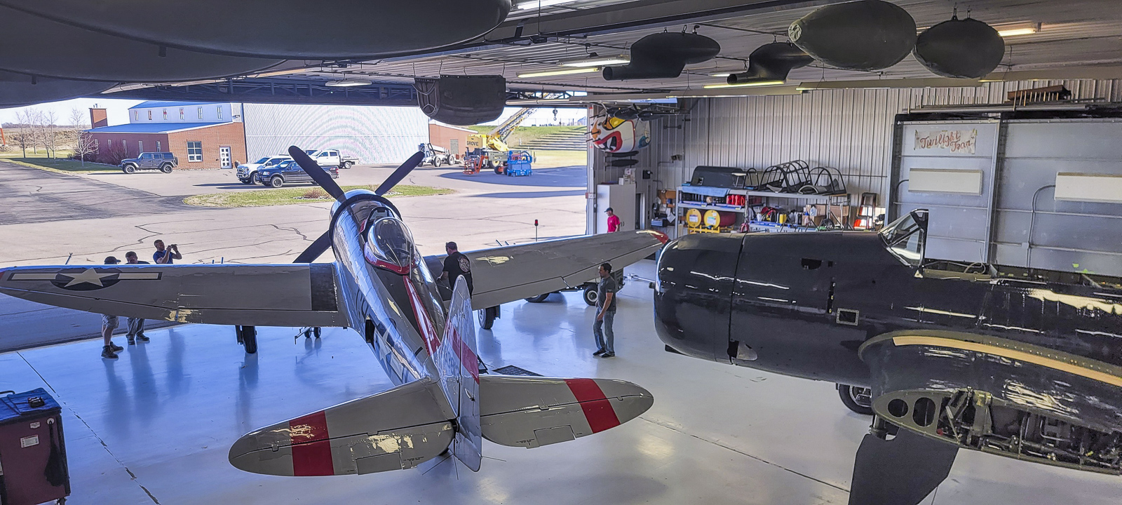 The Thunderbolt parked beside the Helldiver in the Fagen Fighters workshop. (photo via Fagen Fighters WWII Museum)