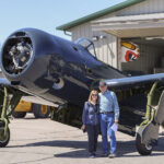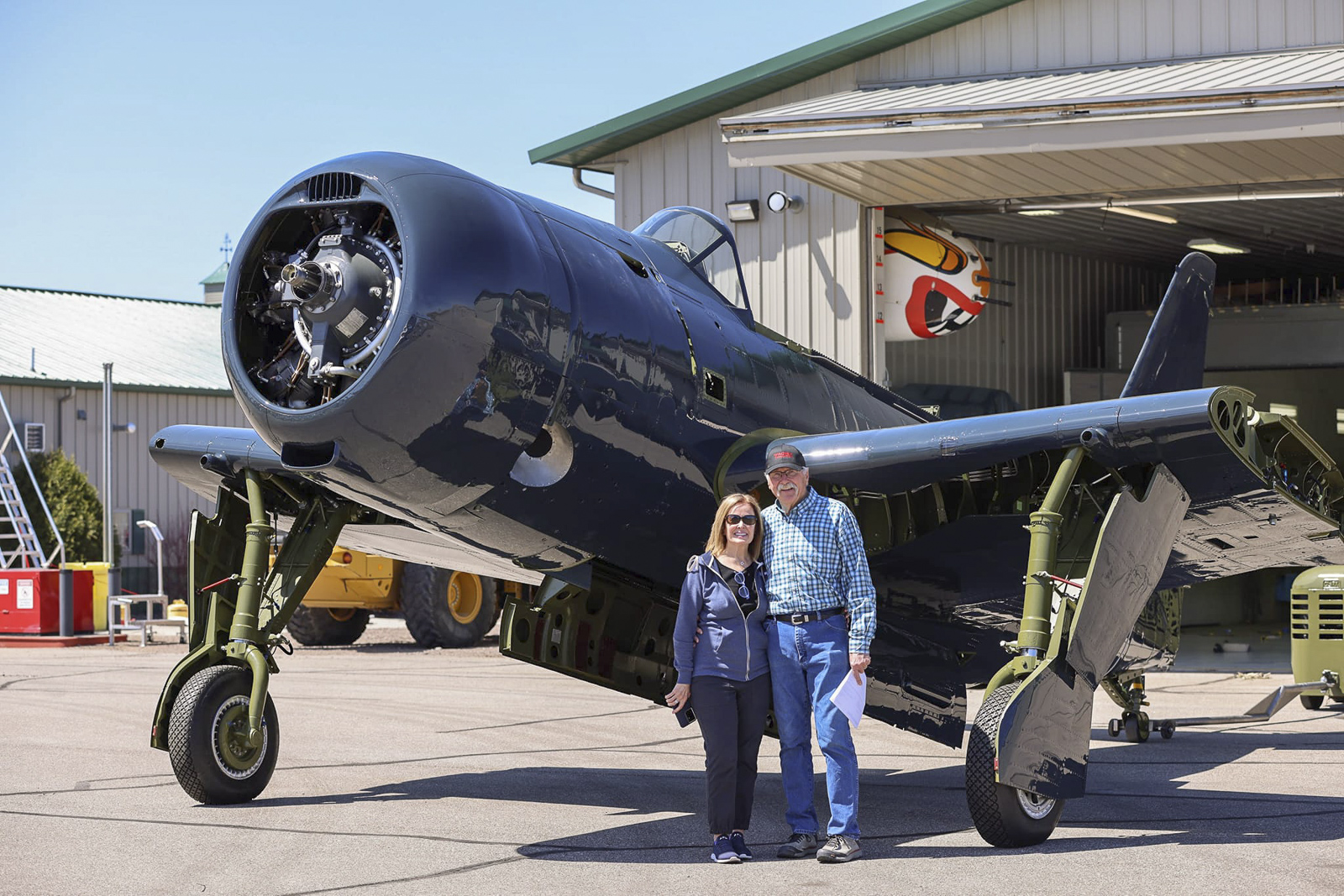 Ron Fagen and his wife, Diane, standing in front of the Helldiver. (photo via Fagen Fighters WWII Museum)