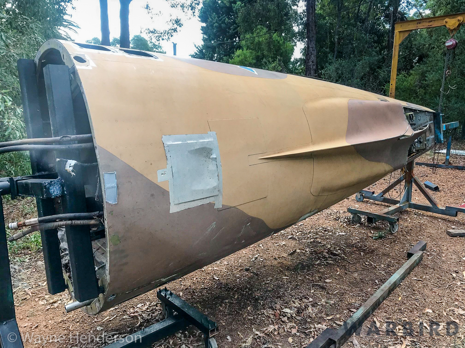 Henderson noted that, “This Sabre jet aircraft is quite complete for display purposes, but is missing several panels. There is a fair bit of damage to the rear fuselage section and one wing requires some work. The rear section is on a rotisserie, and panel work is progressing.” He further indicated that, “Most of the missing panels are not interchangeable [with CAC-built examples], except the tail feathers. I have a lot of work to do in the cockpit with the instrument panel frame, throttle grip, joystick grip needing to be acquired to finalize this area.”