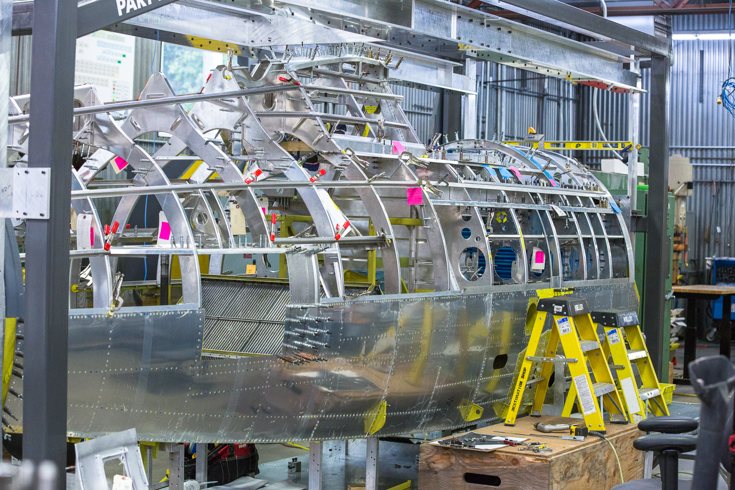 P1344’s rear fuselage section in its jig and almost structurally complete. Notice the tail boom in the background. You can clearly read the serial number L6012 on its side. (photo by Geoff Jones)