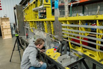 During November and December 2019, the design and production of a new jig for the rear fuselage continued. We already had a fixture for assembly and storage, but a substantial new jig was required for the actual rebuild itself. We received the water-cut stations for each fuselage frame in December as well as the 12 foot length of truss that will form the central ‘shaft’ of the fuselage build fixture.