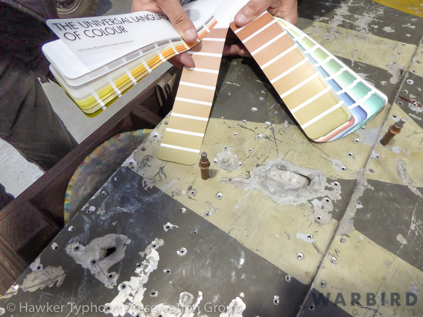 Once the skins had been completely removed from the airframe, the restoration team took some time to determine, as closely as possible, the exact paint colors required to faithfully return the aircraft to its former livery. Thankfully a well-respected specialist team was available to inspect the original WWII paint still remaining on the airframe – they even assayed the interior colors – so now we know exactly which hues to use, and how thickly we need to apply them.