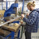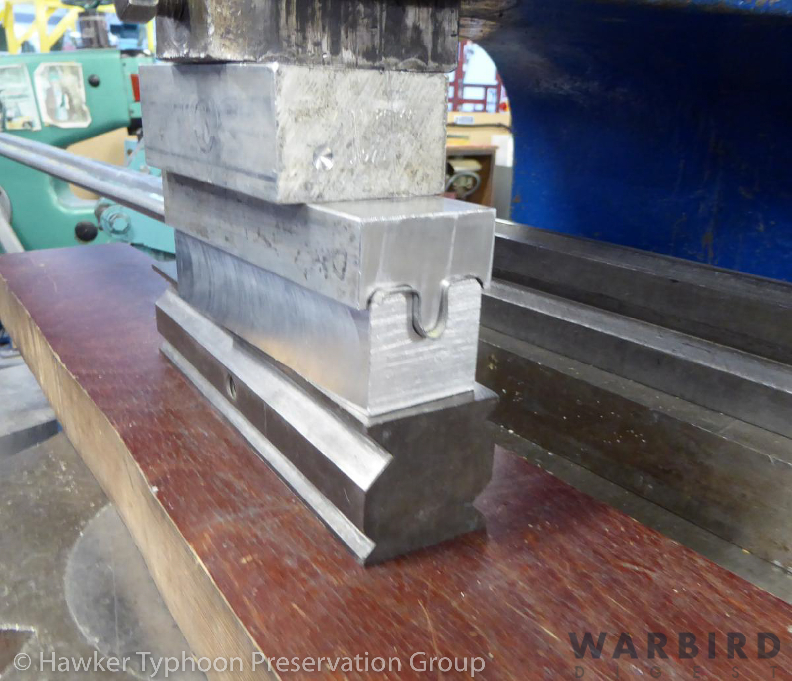 Once all of the rivet heads are removed, the stringer can then easily be separated from the skin panel, and the rivet tail removed without enlarging the original mounting holes. Once the stringers are all separated, the next step is the long process of paint stripping. Despite the outward, somewhat disheveled appearance of some stringers, they proved to be in remarkably good condition underneath the many layers of paint. While some of the stringer sections are intact along their entire length, others, alas, have sustained damage along the way. Each of the stringers underwent an individual assessment process to determine which could be saved. Some only needed minor repair and others needed more extensive rework, but all refurbishment was in line with the official manuals. There were numerous dents, as well as edge ripples in some places, and these required straightening. To avoid the need for “hand-bashing” each defect, Airframe Assemblies made a special press tool. This tool accurately matches the stringer profile and gently presses out the dents – with a little help from a small fly-press.