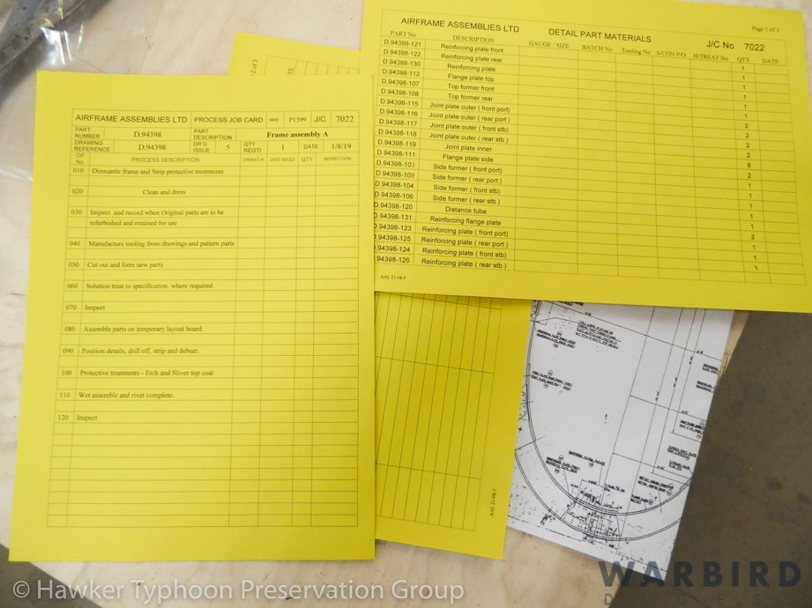 After paint stripping, assessing, Non Destructive Testing, dressing (dents, dings etc) and being chemically treated for corrosion, each piece is etch-primed and then white primer coat is applied. Alongside this process, the dreaded paperwork has to be completed. Items such as Frame A have a detailed work pack/job card. This identifies each part for originality, new build, material specifications (if new) and reference to original factory drawings or a new drawing if none exist. Every single component being used on this aircraft (and any other rebuild), from rivets upwards, has to have a paper trail. As the old saying goes, a restored aircraft is not ready to fly until the weight of all the accrued paperwork matches the weight of the aircraft!