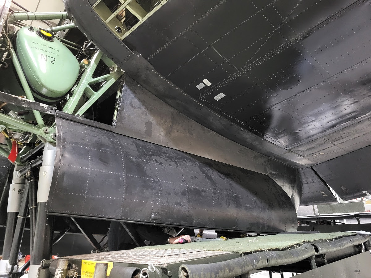 NX611 is structurally complete now, it just requires the powerplant work to be completed. The closure and inspection panels have been fitted along with the port side valance and undercarriage door using hundreds of screws and bolts as well as some aching arms! NX664 donor rear-mid fuselage has also been making progress with further inspections showing problems with some of the repair work that was done to the fuselage prior to its arrival here. Some of the former repairs are not quite the correct shape as they do not meet the stringers and skins correctly. The only solution to this is to remake parts of the formers to the correct shape and create a repair. Dennis has been working on the rea-mid fuselage turret plug. The turret plug is a mod that was implemented for l’Aeronavale Lancasters as they removed the mid-upper turret and used this plug to fill the hole. Although we will not be using the plug while we fit the rear-mid fuselage section we will repair it ready for the French to fit it when they receive the rear-mid fuselage back after we have used it.