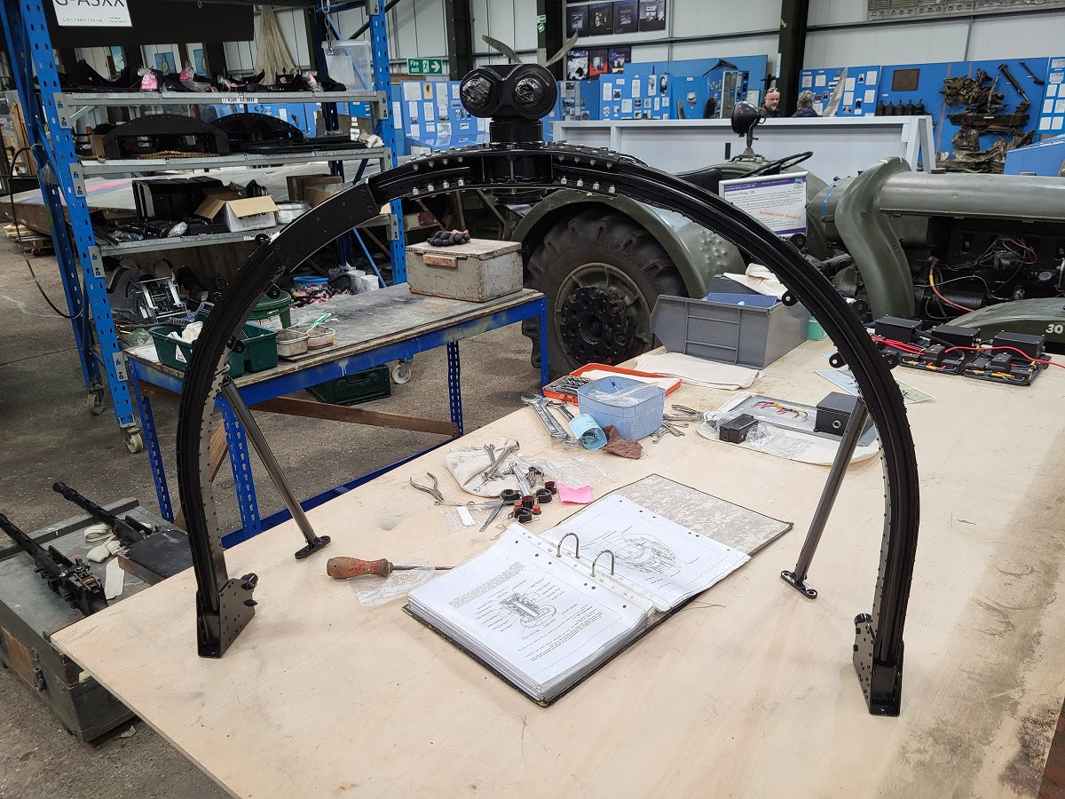 Andy D and Ade have been progressing with the FN5 front turret restoration and the FN82 tail turret systems work. Andy has been restoring the electrical power boxes that serve the rear turret ammunition booster feed motors. We don’t plan to have the motors serviceable but all of the parts of the system will be restored and look cosmetically correct. Ade has been starting to assemble all of the sub-assemblies that there are within the FN5 front turret. He started with the top hoop that holds the rotating service joint for the hydraulics and electrics situated at the top center of the turret and created the join between the solid aluminum back and the Perspex front of the cupola. The front turret restoration is awaiting some replacement rotating rings before the whole turret can be reassembled so working on subassemblies is allowing progress while we source the required rings.