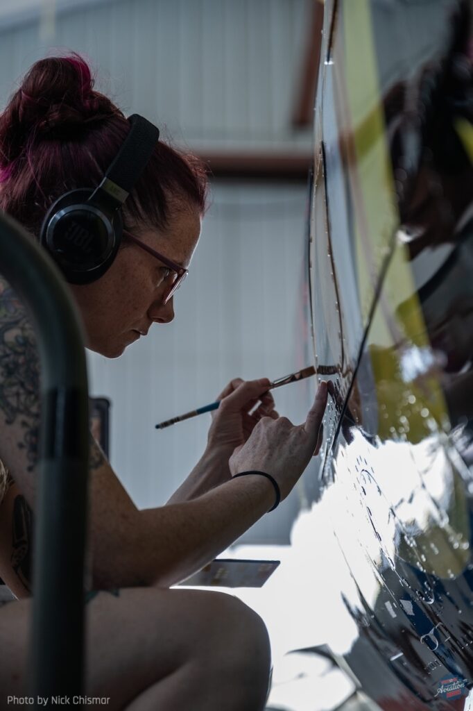 Work was well underway just two weeks before the member’s day event. Tucked inside the main hangar, Hummelstown, PA artist Jennifer “Hot Rod Jen” Thomas was steadying her hand against the side of the P-61. Jen’s interest in warbirds began with family ties as both her uncle and grandfather had flown Stearmans and worked alongside her father on the Berlin Airlift Historical Foundation’s Douglas C-54 Spirit of Freedom. While Jen is well known for her automotive pinstriping, the P-61 is not her first piece of aviation nose art.