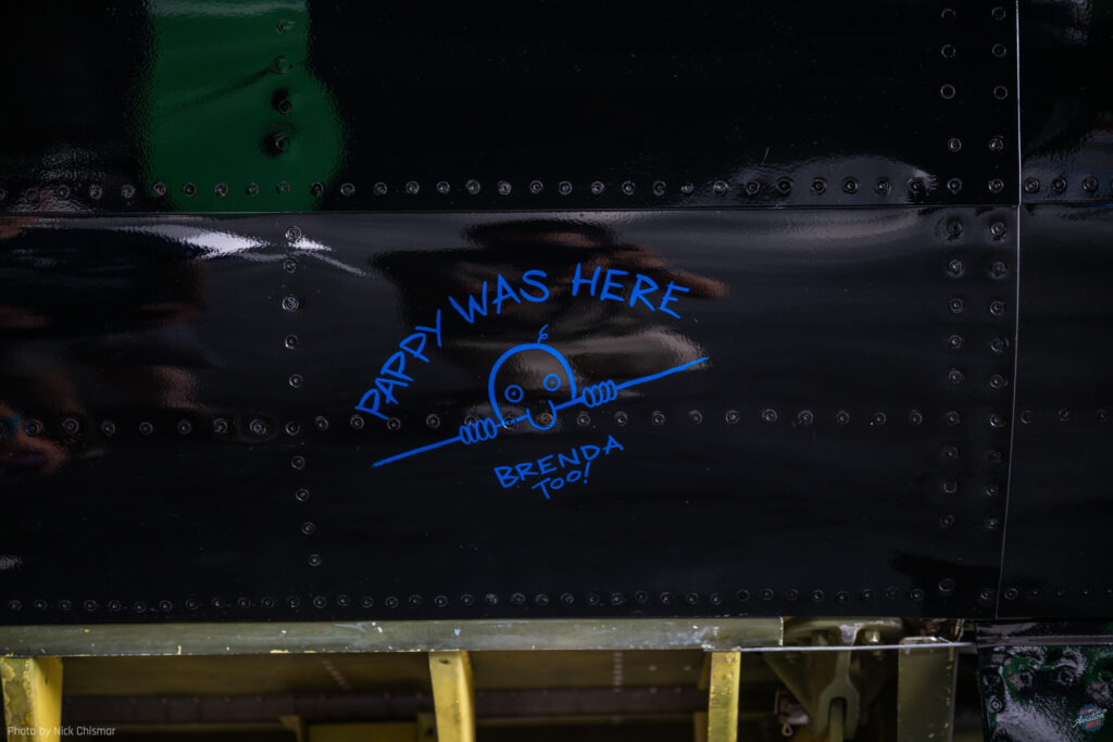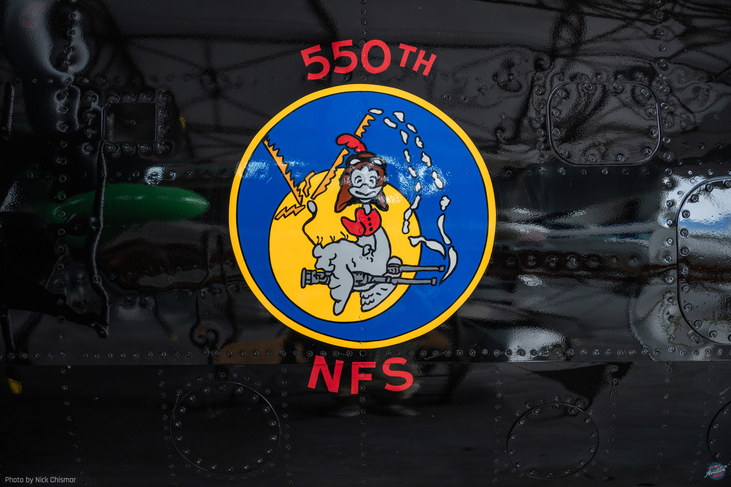 When member’s day came around and the first visitors rounded the tail of the museum’s replica Aichi D3A Val there was a sense of awe as they spotted the nose art. Comments could be heard about the level of detail and simply how impressive it was. As visitors continued and made their way to the other side of the P-61 they immediately took note of the emblem of the 550th Night Fighter Squadron, painted completely by freehand on the aircraft. Painted to the emblem’s left however were three names. Beneath the cockpit could be seen the name “Annie” in honor of Russ’ late mother, painted in bright red. Below that and in a more subtle blue was the image of the iconic “Kilroy” with the words “Pappy was here. Brenda too.”: a tribute to Russ’ late father Eugene and Brenda Saylor, both of whom had spent countless hours to make their shared dream a reality.