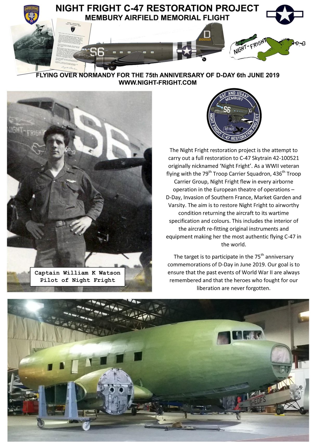 As we move towards the 75th anniversary of the Normandy Invasion next year, there are a number of groups around the world preparing to take part in the Daks Over Normandy commemorative ceremonies which will see several dozen Douglas C-47s/Dakotas re-enacting the paratroop drops over France on June 6th, 2019. One of these organizations is working at fever pitch to thoroughly restore and refurbish Douglas C-47A-65-DL 42-100521 almost from the ground up. Nicknamed Night-Fright, this aircraft is a veteran of the D-Day campaign herself, flying from RAF Membury with the 79th Troop Carrier Squadron of the 436th Troop Carrier Group out of RAF Membury, near Lambourn in Berkshire, England.