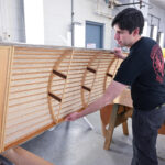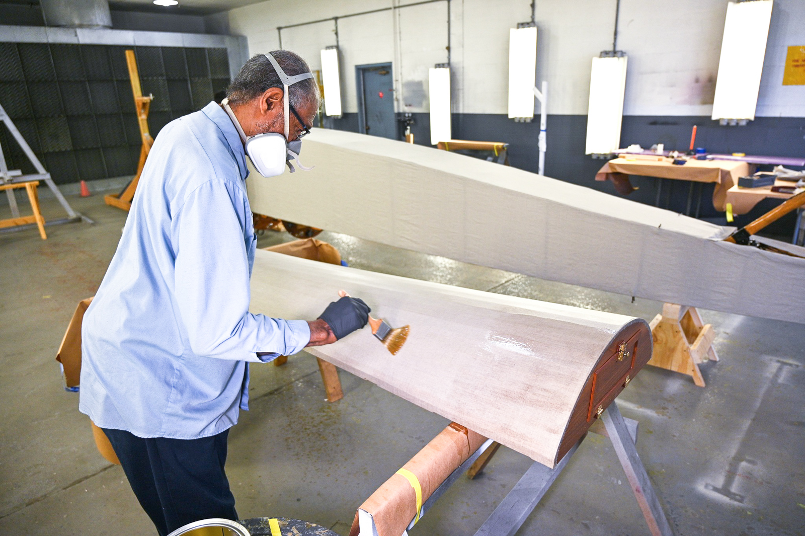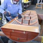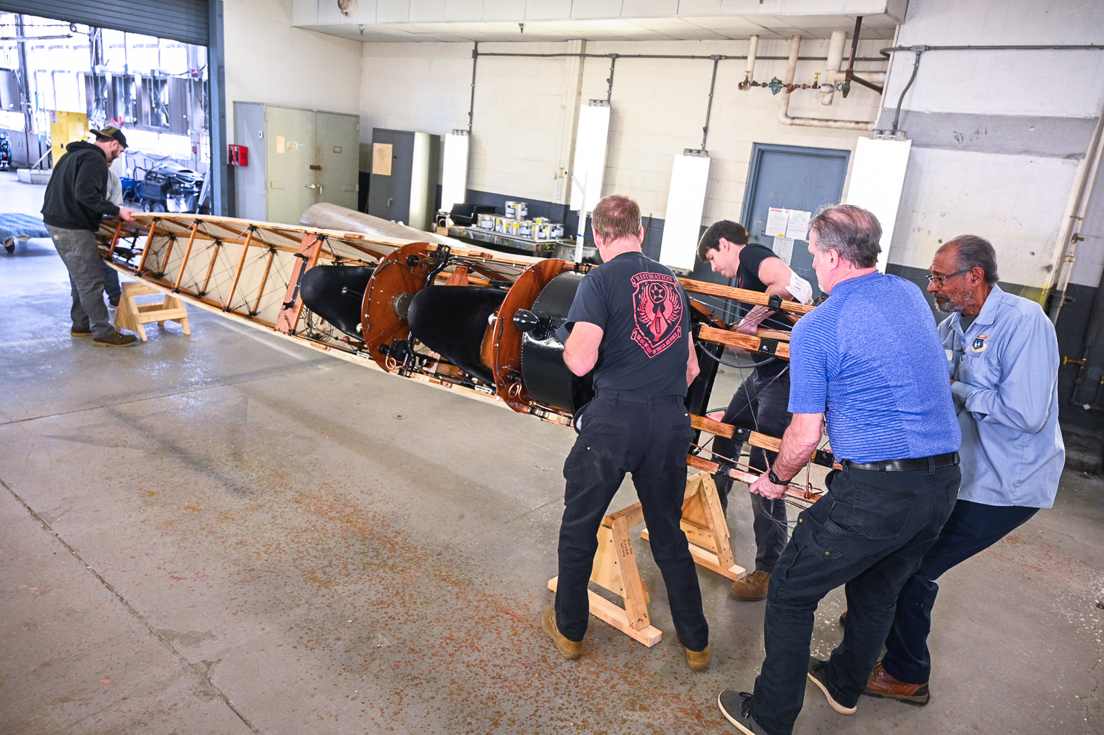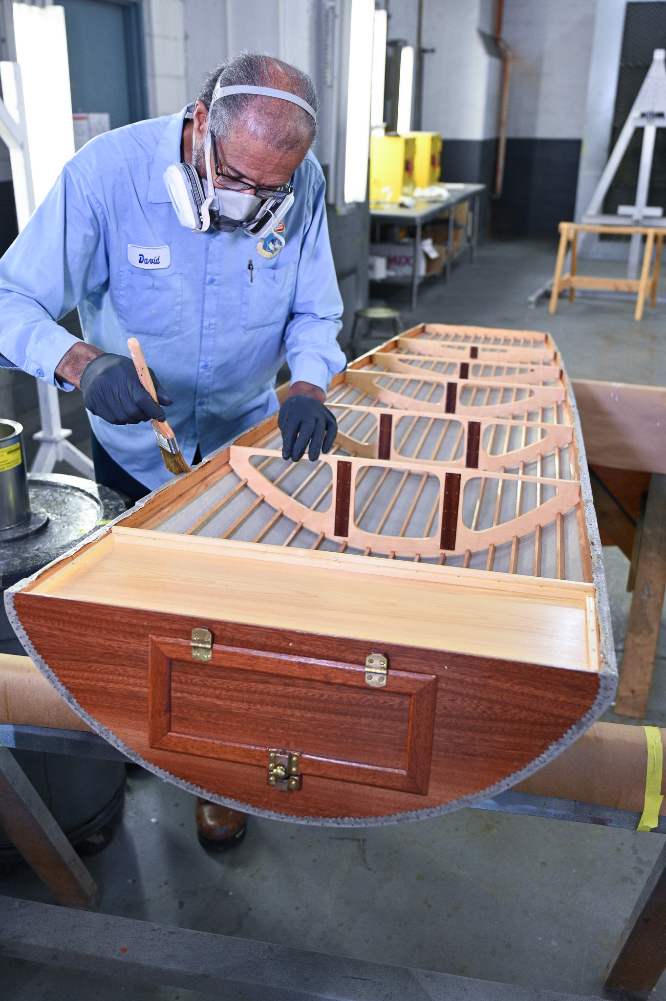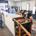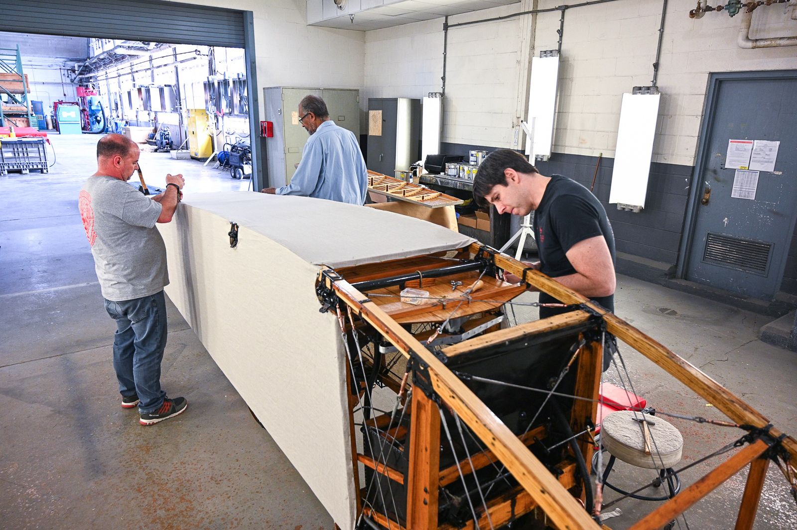 Museum restoration specialists Casey Simmons (left) and Dave Robb (right) tack down the fabric covering to the fuselage box frame belonging to the Curtiss JN-4D Jenny at the National Museum of the U.S. Air Force in Dayton, Ohio. (photo by Ken LaRock NMUSAF)