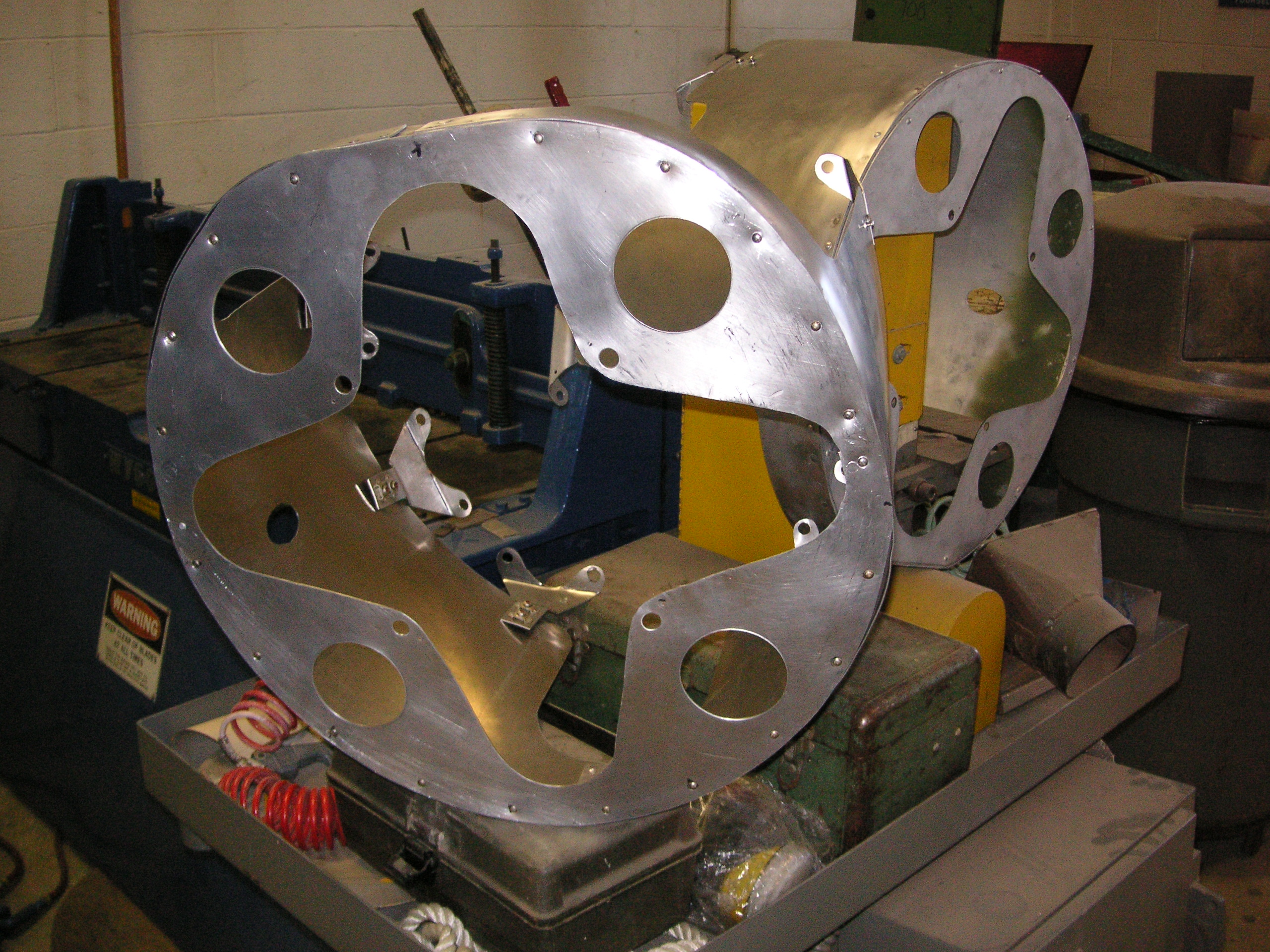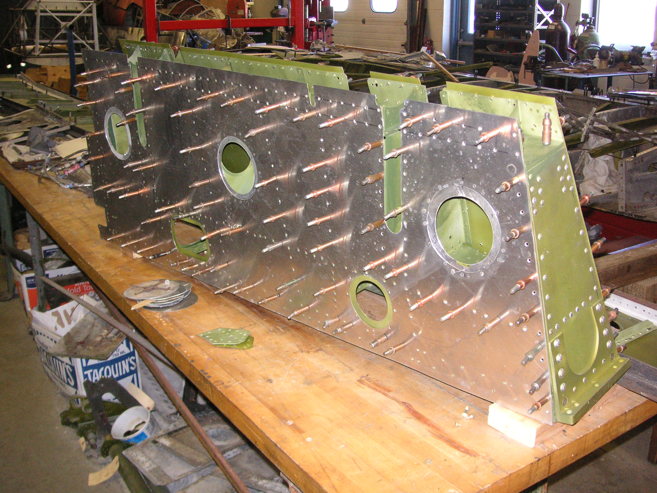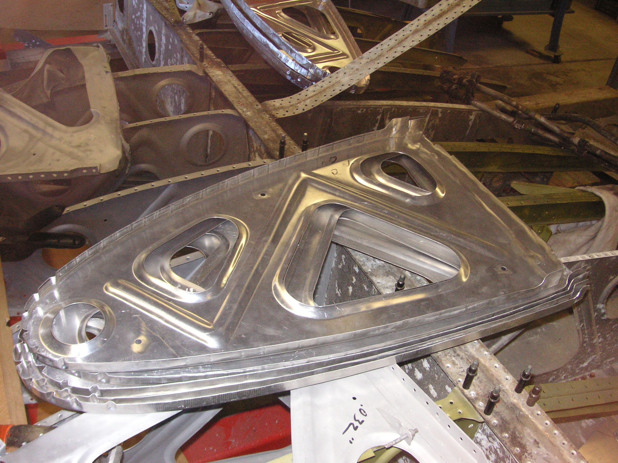 Freshly formed leading edge ribs for the Black Widow’s outer wing panels. Following forming in soft 2024-T0 aluminum, the ribs will be heat treated to bring them up to their full 2024-T6 tensile strength. (photo via Russ Strine)