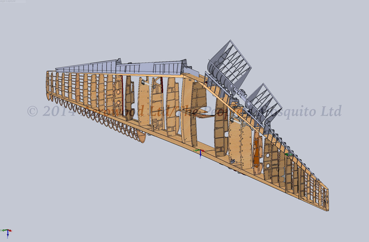 Corin McCrae remarked on the quality of the Canadian Spruce, “It is the finest quality I’ve ever used for a wing”. The rib pattern cutting process used today by Aerowood is significantly different to that used when the Mosquito was being produced in the 1940s. Today’s process uses a Computer Aided Design (CAD) system and the cutting is computer-controlled. This makes for a cutting process that is much more precise and a lot faster than in earlier times, but combined with the original hand-finishing skills, results in an accurate build and reduces any production flaws.