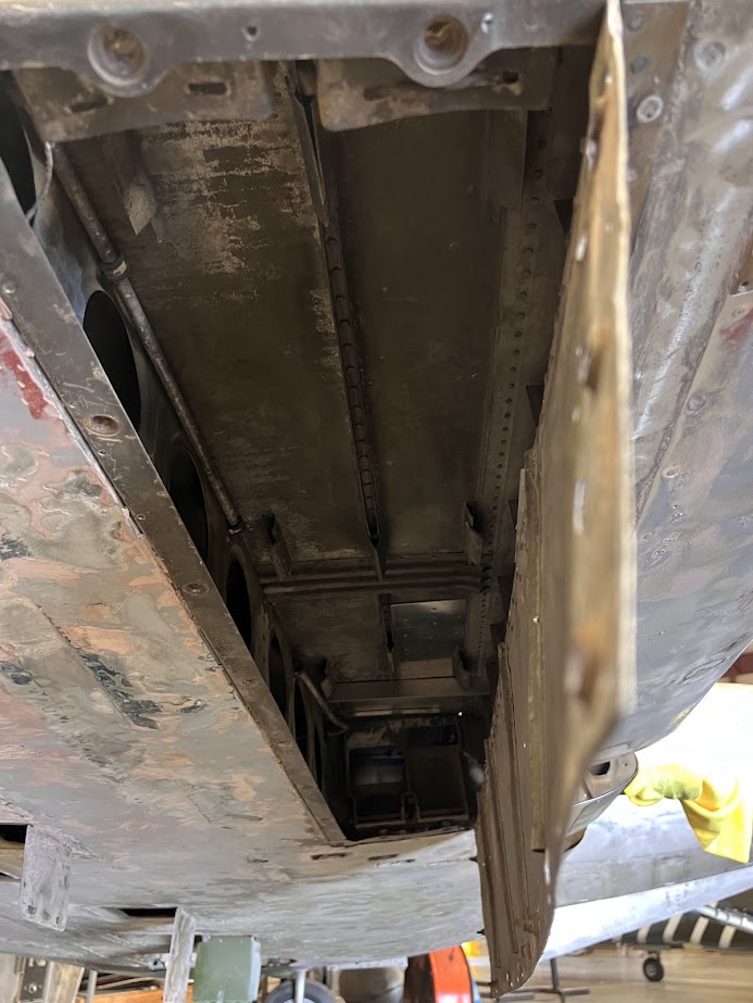 Regardless, the P-39N Airacobra painted as “Little Sir Echo”/”Small Fry” was a static display at the Planes of Fame, but in 2019 the Planes of Fame began on a new restoration of the aircraft. Layers of Bondo were stripped from the airplane, especially from the upper and lower surfaces of the wings. Work progressed slowly but steadily, in spite of events such as the COVID-19 pandemic, which put a temporary halt to the project. The recent stages of the project have seen the Airacobra’s restoration become the domain of Planes of Fame mechanic and researcher Cory O’Bryan, who also works on projects for Steve Hinton’s workshop Fighter Rebuilders. Though the projects at Fighter Rebuilders have sometimes taken priority, O’Bryan has been working extensively on adding new sheet metal, replacing corroded panels with holes that were masked by layers of Bondo.