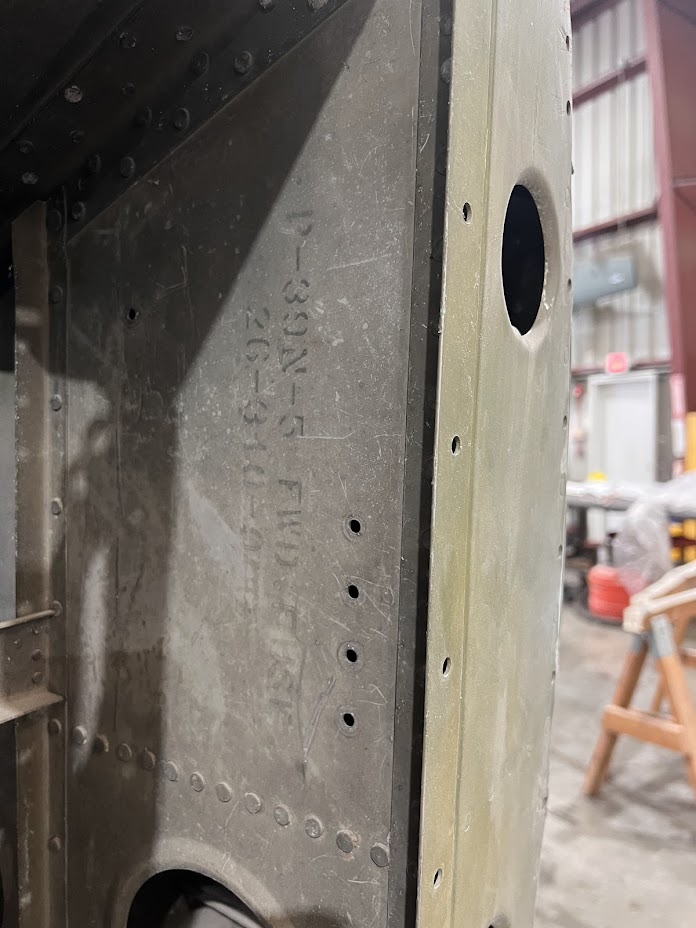 Further discoveries have been made on the Airacobra, and O’Bryan has discovered the production stamp on the wing root of the left wing. According to Bell Aircraft records, these suggest that this section came from P-39N 42-18814. However, this aircraft, another Tadji recovery, is often listed as the example now displayed at the Pima Air and Space Museum in Tucson, Arizona under the name “Girlie”. Given the mix-up of P-39 airframes at David Tallichet’s shop in the 1970s, it will be hard to prove whether this aircraft is 42-19027, as claimed by Charles Darby, or another Tadji P-39, but in any case, the left side of the P-39’s tail has been painted with the incomplete serial number “42-1881-“, with plans to assign a final number upon further examination.