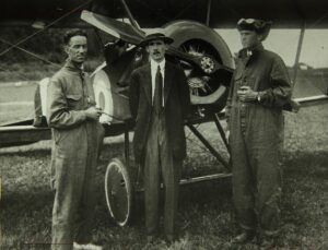 The ‘Tommy’s designer, Benjamin Douglas Thomas, is seen here between two aviators, probably during the making of a postwar film. He had worked on the design of the Curtiss Jenny prior to joining Thomas-Morse, and thus this Englishman had a hand in two of America’s most important types in the 1910s and 1920s. The Center is a production line of the Scouts stretching as far as the eye can see. On the right is an S-4 modified with an OX-5 engine for racing postwar, carrying the number 5 on the tail. [Via the San Diego Air & Space Museum Flickr feed.]