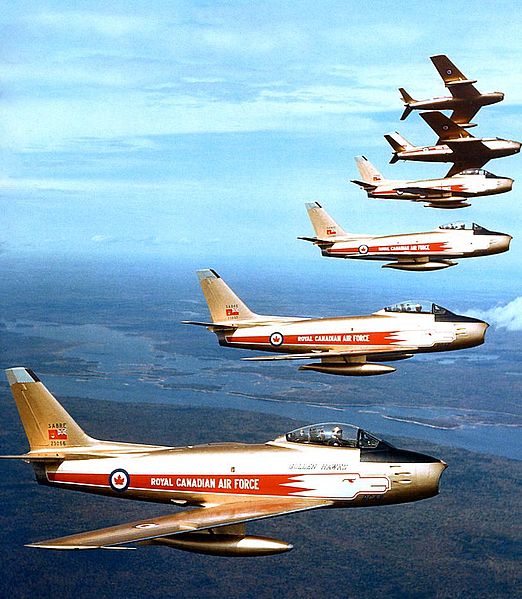 This aircraft is one of the original 6 Golden Hawk Aircraft which performed for the RCAF from the late 50’s to early 60’s. The Golden Hawks were a Canadian military aerobatic flying team established in 1959 to celebrate the 35th anniversary of the Royal Canadian Air Force (RCAF) and the “Golden” 50th anniversary of Canadian flight, which began with the AEA Silver Dart in 1909. Sabres used by the Golden Hawks aerobatic team belonged to the Sabre Transition Unit and later the (Fighter) Operational Training Unit of CFB Chatham, New Brunswick. Among other aerial maneuvers performed by the Golden Hawks, the pilots would sometimes stagger past the crowd at low altitude with the canopy open waving at the spectators.