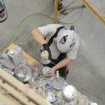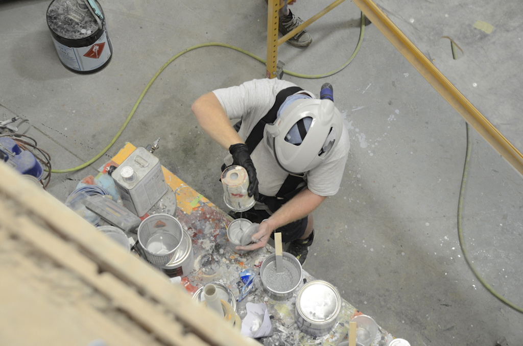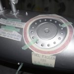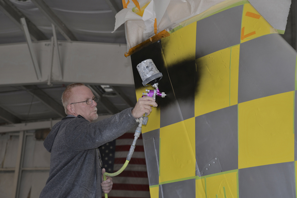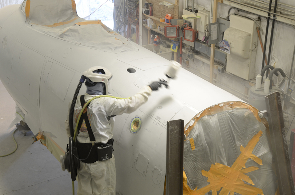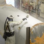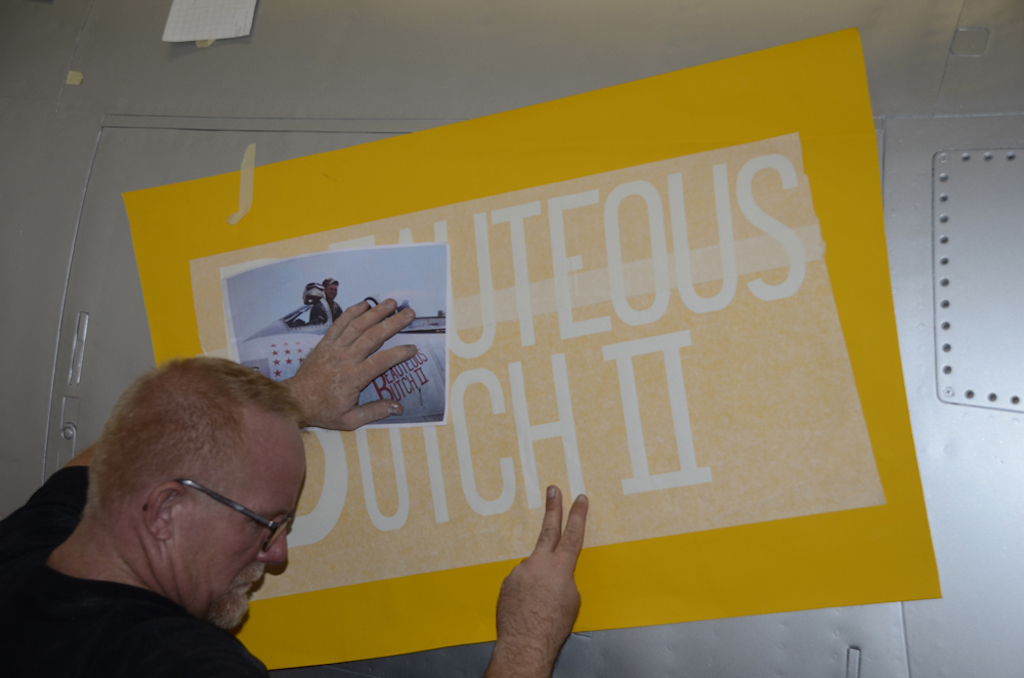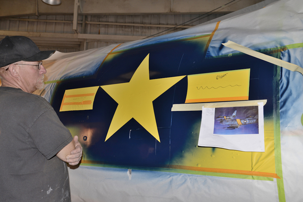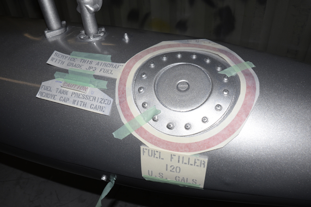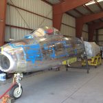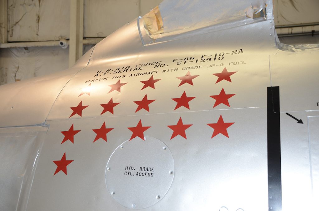 As mentioned earlier, F-86F 52-5116 is presently under restoration at Doug Matthew’s shop, Classic Fighters of America in Titusville, Florida. With the aircraft in sections consisting of the forward and aft fuselages, and the wings removed, Cris Kaufmann began the process of removing the old paint. He started blasting the exterior with crushed walnut shells to safely strip off much of the old paint without damaging the metal, then used conventional paint stripper to remove the rest. A wash of sand and acid followed, with the application of Bonderite® to finish up. Next came a treatment of self-etch and epoxy primer. Minor dents and flaws in the fuselage panels were repaired at this point and then the team sprayed a layer of high-build primer on the airframe. After this dried, the primer received a gentle sanding in preparation for the first coating of paint. Layers of silver and clear coat went on. Once the paint is applied and set, a final layer of clear-coat went on.