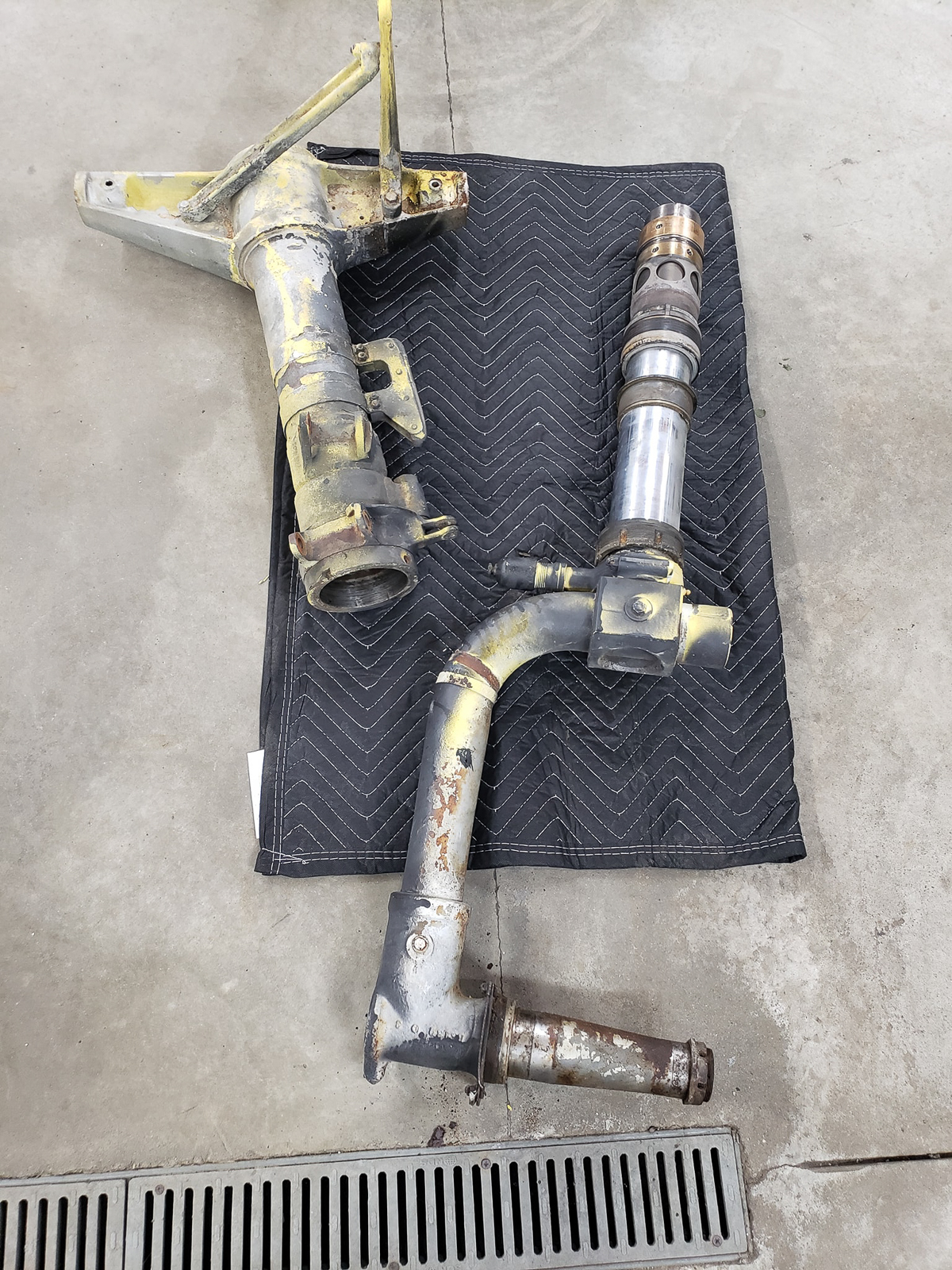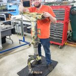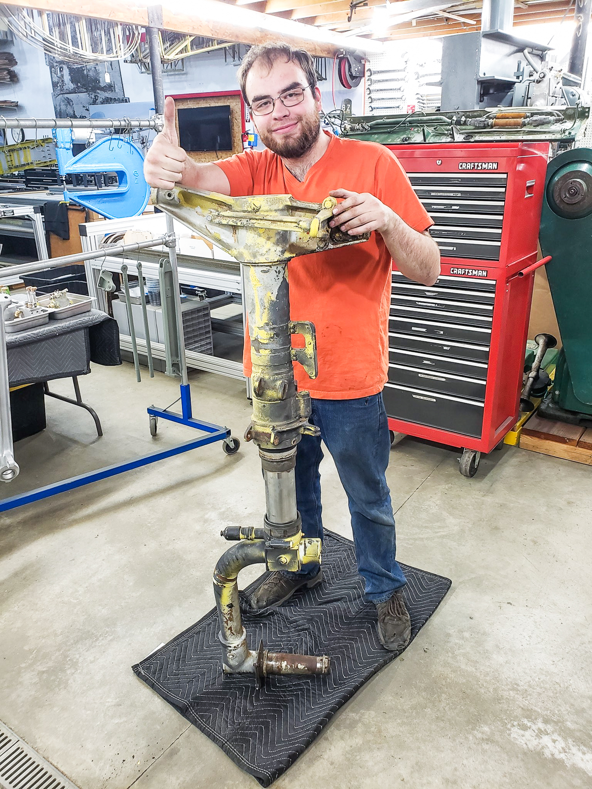 Sean with the nose gear leg after he removed it for overhaul from the fuselage. (image via Patrick Mihalek)