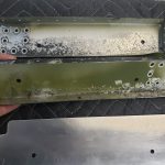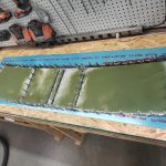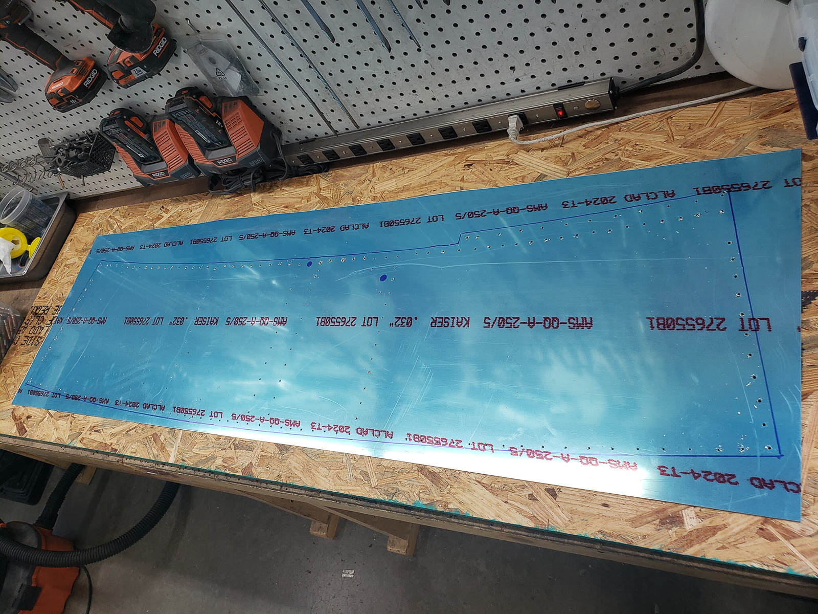 The new skin section has now had all of the holes copied over from the original part, and is ready to be trimmed to shape. (via Warbirds of Glory Museum)