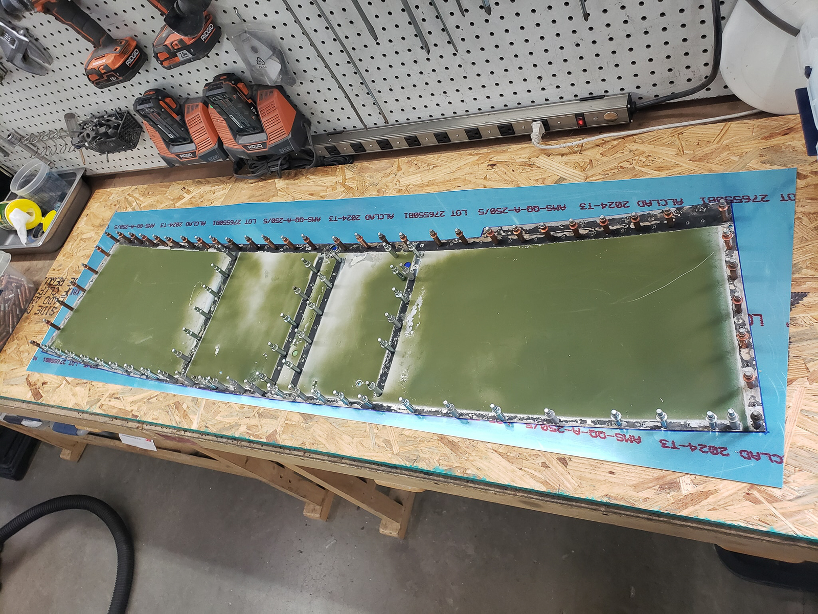 • The rear spar assembly is painted, fully clecoed in the fixture and ready for riveting together.