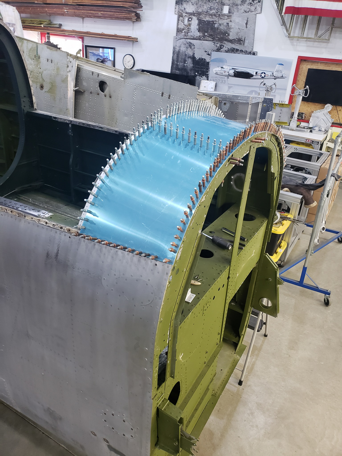 The new fuselage cowling clecoed in place. It still needs dimpling at this point, but this is the first new skin to go on the B-25’s fuselage! (image via Patrick Mihalek)