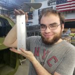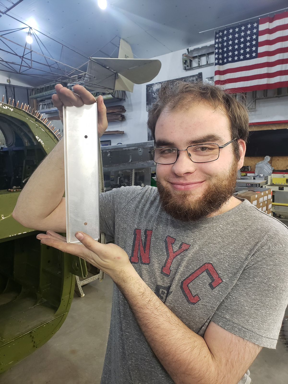 Sean proudly showing off the completed ribs after he created the parts, all the way from designing them from original drawings on the computer, to making the dies to form them, to cutting out the parts and then shaping them to the correct dimensions. (via Warbirds of Glory Museum)