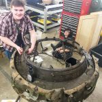Katelyn (by the tool chest) and Leland (left) working hard on removing parts from one of the many B-25 engine mounts at the museum so that parts can be inspected and inventoried for future use. (image via Patrick Mihalek)
