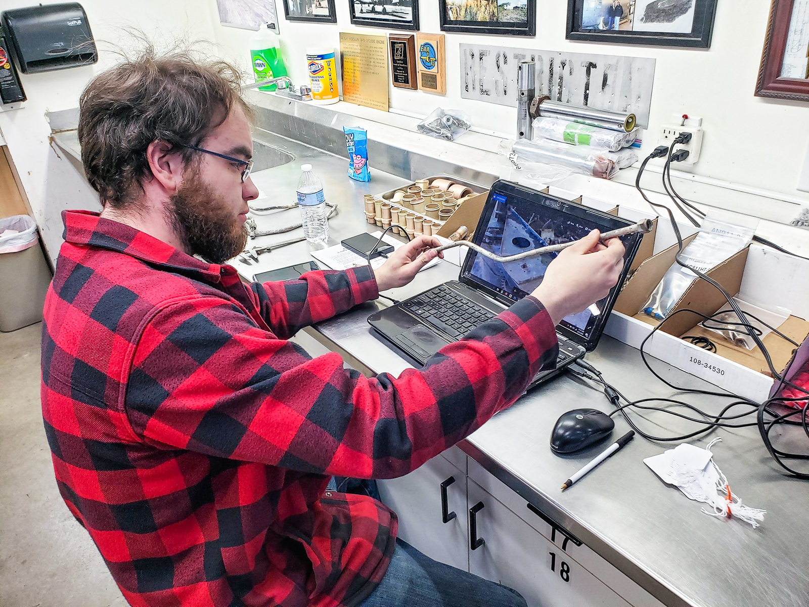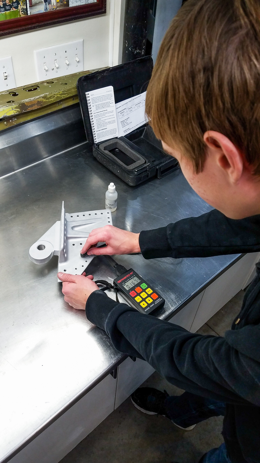 Working with a Panelmetrics NDT tool to measure the thickness of any corrosion in the original forging. (image via Patrick Mihalek)