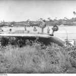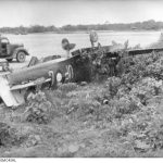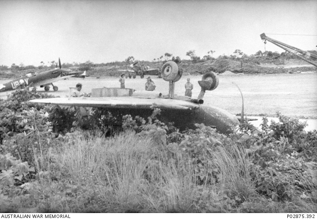 This aircraft rolled off Vickers-Supermarine’s satellite factory at Castle Bromwich at the end of 1942. Her first RAF posting was to 39 Maintenance Unit at RAF Colerne on January 2, 1943, moving on to 215 MU later that month at Locharbriggs in Scotland. There she was loaded aboard the SS Tijuca on February 4th for onward shipment to Australia along with a number of other Spitfires for service with the Royal Australian Air Force. After arrival in Australia in mid-April, 1943, she entered the RAAF as A58-178, passing through No.1 Aircraft Depot at RAAF Laverton, before joining her first operational unit, RAAF 79 Squadron, on on June 1st, 1943, coded ‘UP-G’. 79 Squadron formed up at Laverton, and began moving to the frontline base at Vivigani Airfield on Goodenough Island in New Guinea. The unit moved to Kiriwina, one of the Trobriand Islands now belonging to Papua New Guinea, during August, 1943. Kiriwina, at the time, was the closest Allied airfield to Japanese units then based at Rabaul. The Spitfire was involved in an accident at Kiriwina on December January 12th, 1944. While landing in gusty conditions without flaps on a wet summer’s day, F/Sgt Dudley Gringlington flipped the Spitfire on her back. While Gringlington suffered minor injuries, the Spitfire wasn’t quite so lucky, as the following images show…