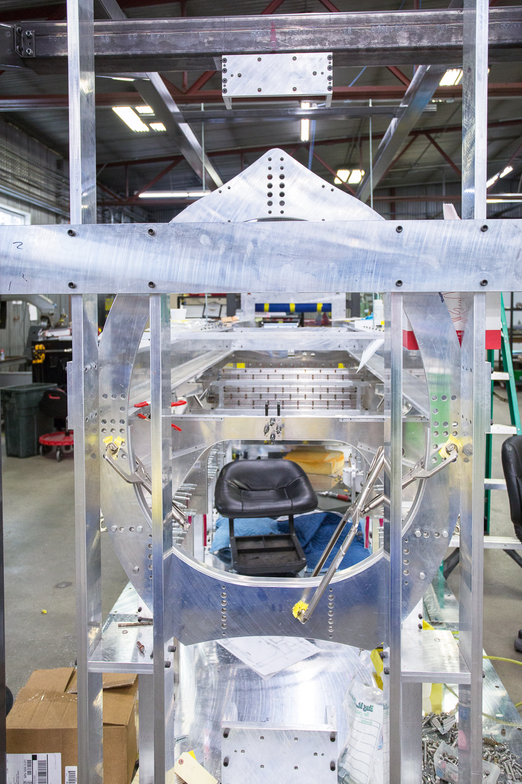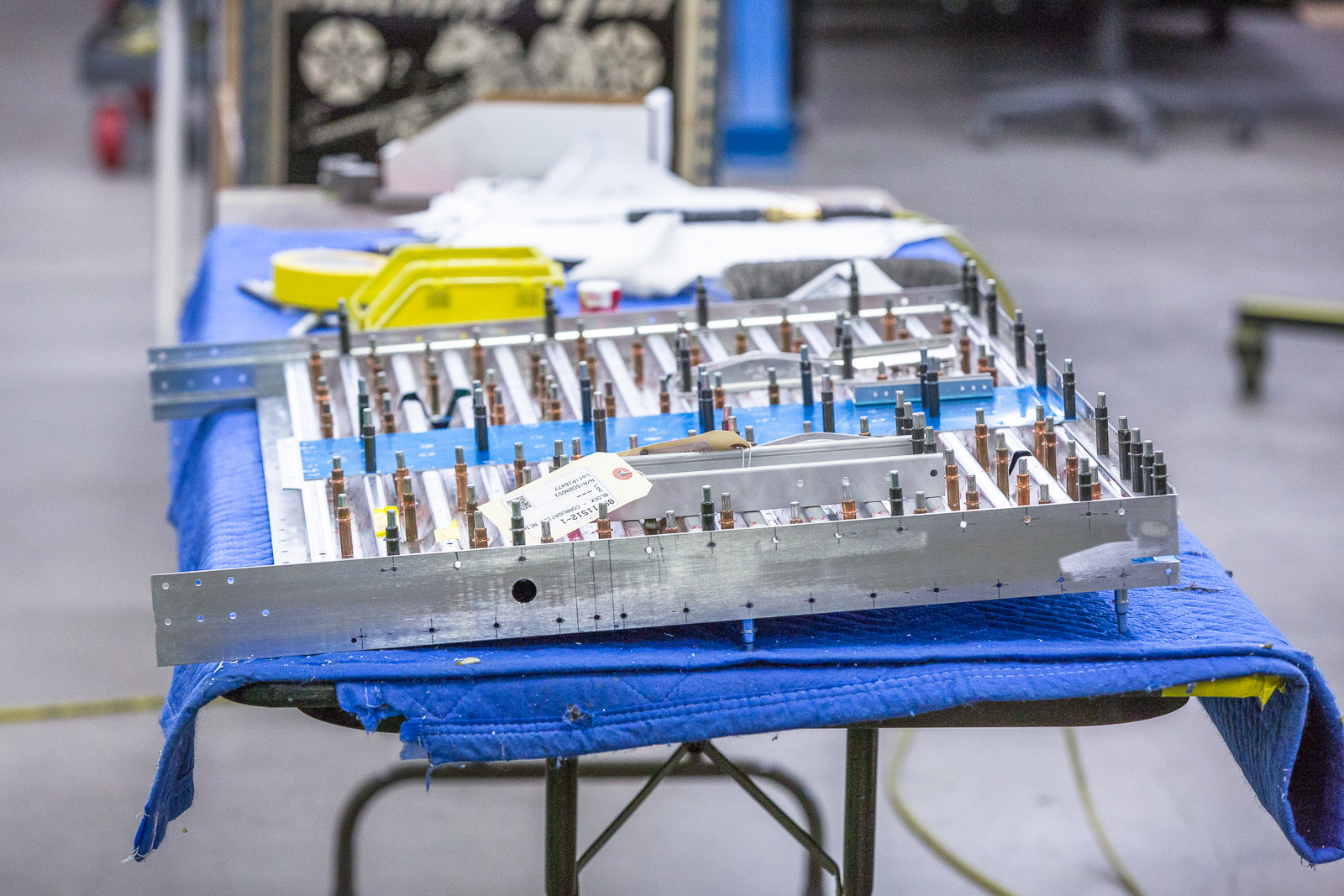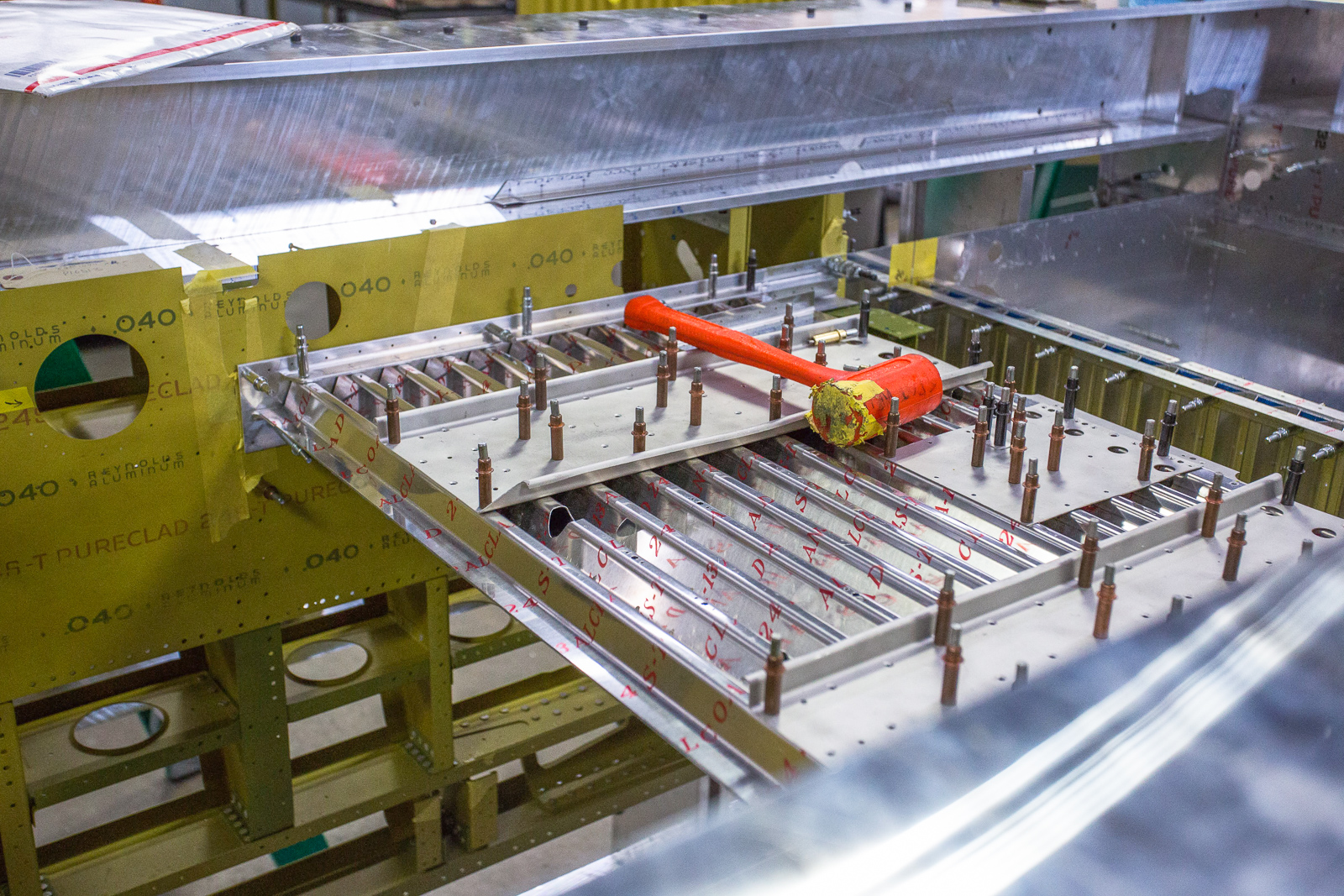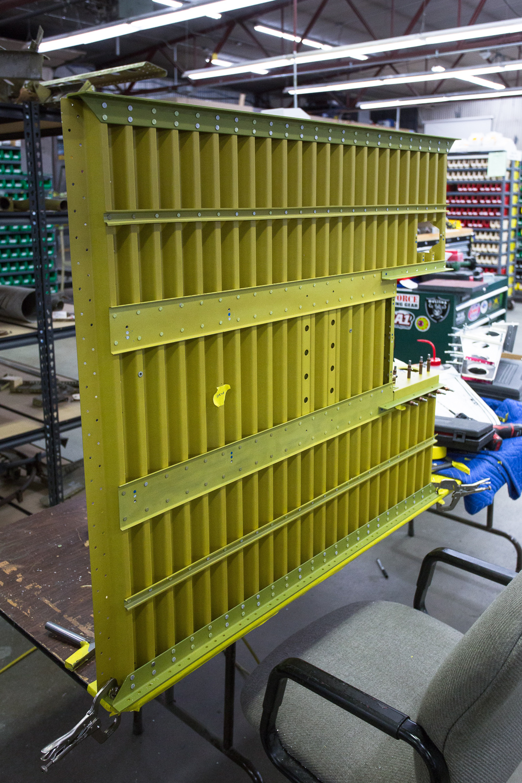 The work involves fitting, trimming, and trial assembly. Once the structure has been initially put together with clecos and everything is correct, much of it has to be disassembled and sent to paint for a zinc chromate coating.