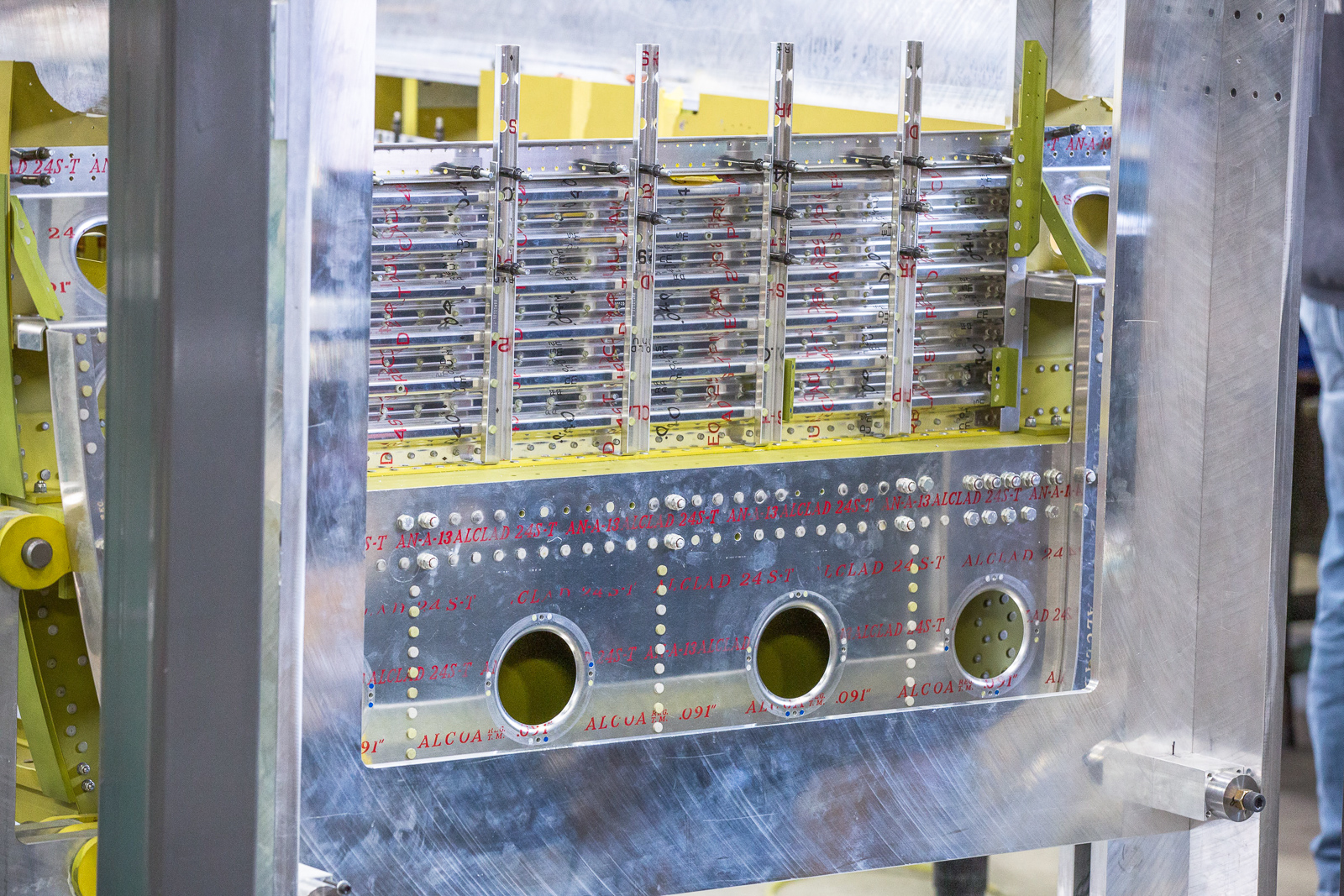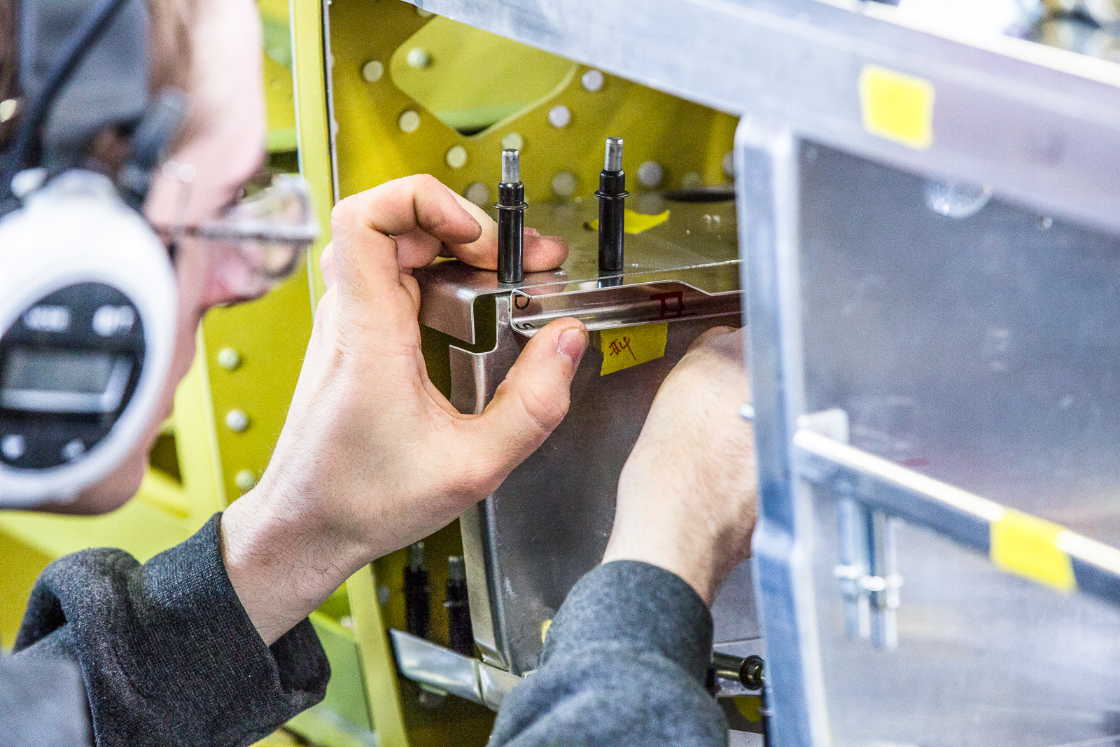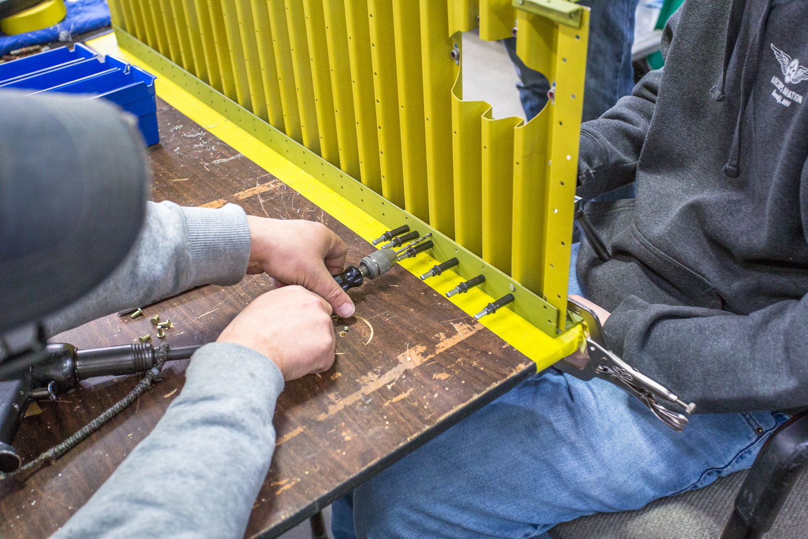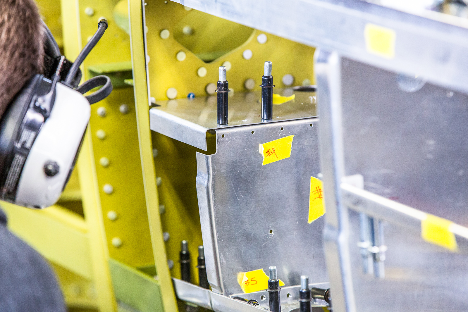The work involves fitting, trimming, and trial assembly. Once the structure has been initially put together with clecos and everything is correct, much of it has to be disassembled and sent to paint for a zinc chromate coating.