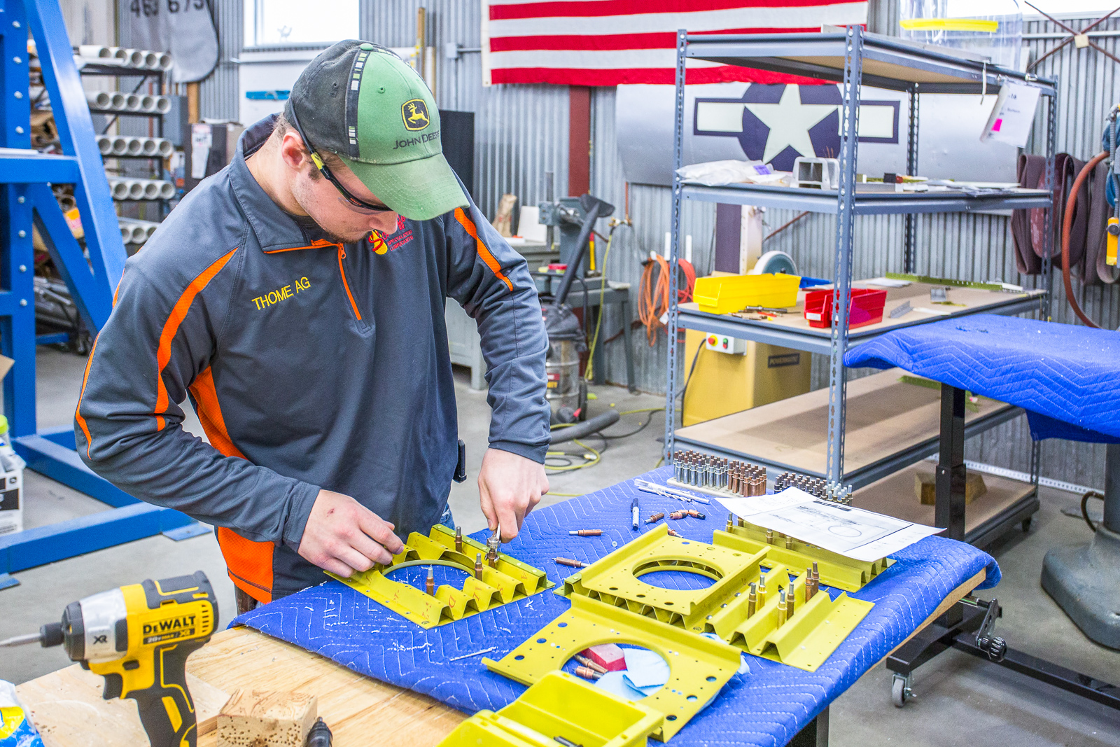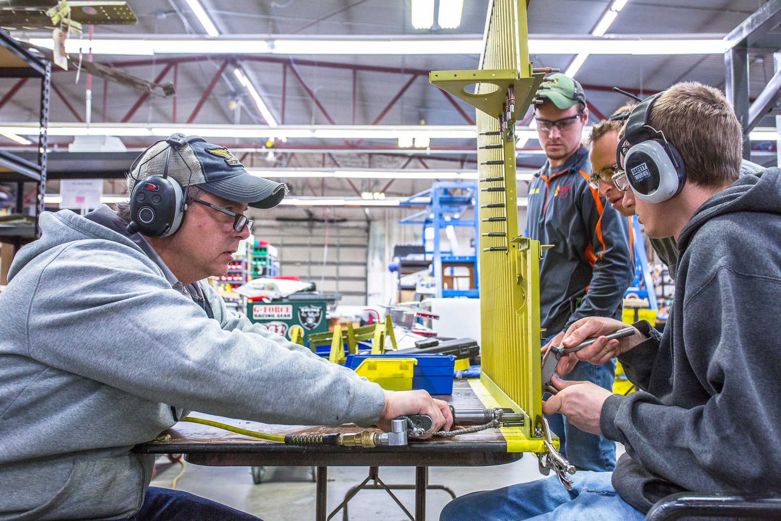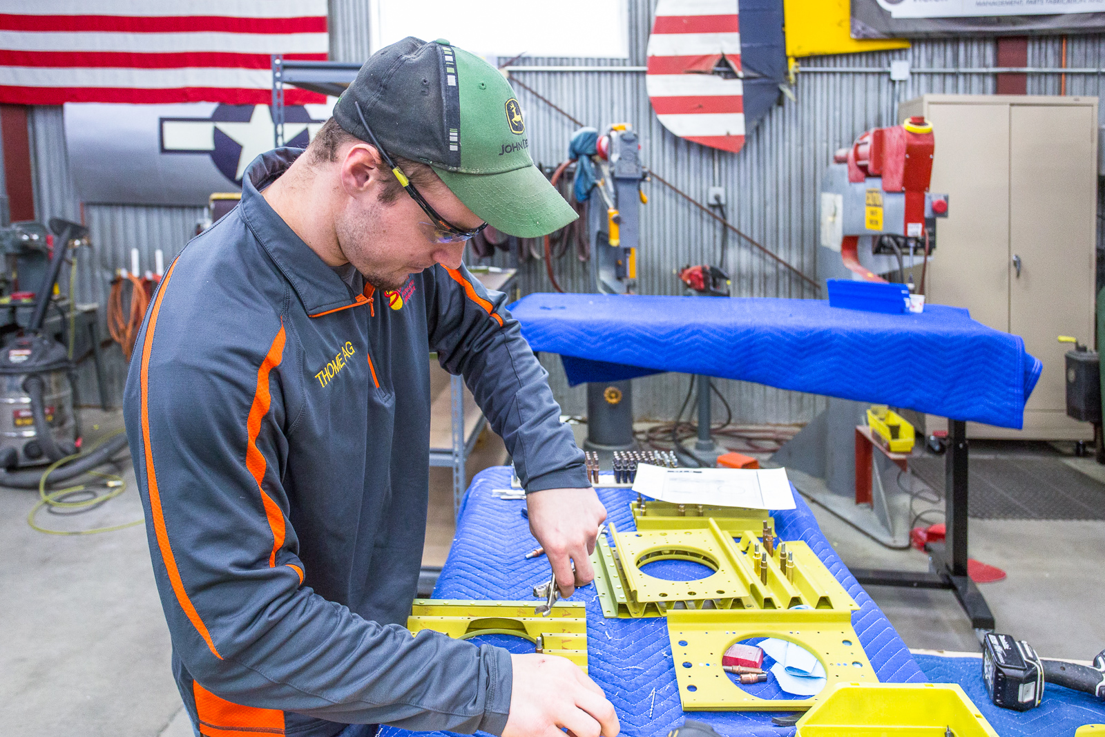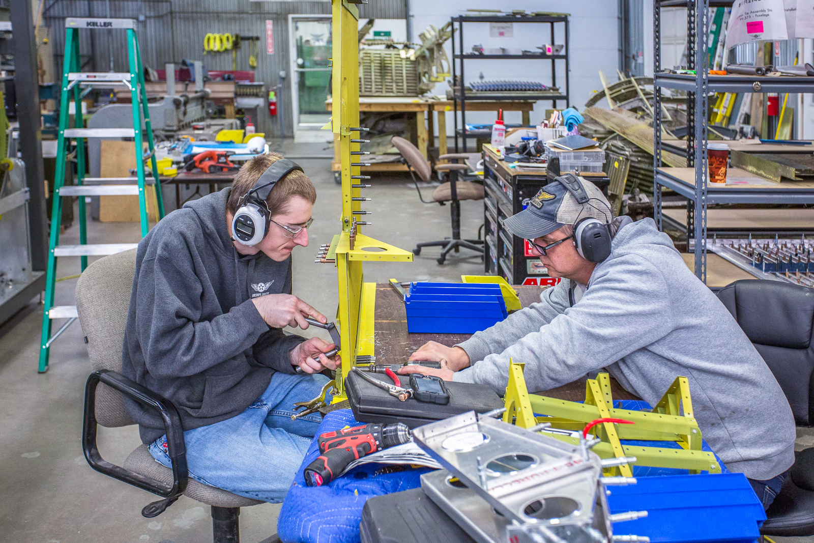 The work involves fitting, trimming, and trial assembly. Once the structure has been initially put together with clecos and everything is correct, much of it has to be disassembled and sent to paint for a zinc chromate coating.