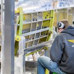 The inside of the cockpit will have quite a bit of visible corrugation.Dave works on the fit of a fuselage former, sitting inside the main fuel tank area of the lower fuselage.. (photo by John LaTourelle)This drawings shows some of the fuselage stations. Station 101.625 is between the red marks added to the drawing.Here is part of the bulkhead at the forward wing crosstie station or station 101.625. (photo by John LaTourelle)A longer shot lets us see the relationship between the corrugated portion and the rest of the bulkhead. (photo by John LaTourelle)Another section of the bulkhead awaits installation; it is formed, drilled, and painted on one side. (photo by John LaTourelle)Robb is working on one of the main longerons.. (photo by John LaTourelle)Here we can see the part that was on the bench as it looks installed. (photo by John LaTourelle)Notice the curve as the longeron sweeps upward toward the tail. (photo by John LaTourelle)On the backside of the station 101.625 bulkhead is a hole where the cockpit ventilator tube connects via nutplates. (photo by John LaTourelle)Here we can see that the other end of the same longeron extends all the way to the forward wing tie station, 101.625. (photo by John LaTourelle)The structure produced by this kind of engineering is what resulted in the P-47’s well-deserved reputation for strength. (photo by John LaTourelle)Clamps and clecos hold the structure together as each part is fitted and later attached. (photo by John LaTourelle)These fuselage formers are nearer the tail at station 285. Notice the stiffeners riveted to them.. (photo by John LaTourelle)This view of crosstie fasteners shows the remarkable number of bolts used to hold the wing fittings in place. (photo by John LaTourelle)At the left is the station where the tail cone attaches; to the right is the rear wing crosstie bulkhead.. (photo by John LaTourelle)Aaron checks the alignment of a former. (photo by John LaTourelle)Randy drills the rear crosstie bulkhead for another rivet. This bulkhead is at station 148.375. That makes it 46.7 inches aft of the forward crosstie bulkhead at 101.675. (photo by John LaTourelle)The large aluminum beams are at the parting line between the bottom half of the fuselage and top half. (photo by John LaTourelle)Here is part of the bulkhead at the forward wing crosstie station or station 101.625. (photo by John LaTourelle)This is the backside of the forward crosstie bulkhead. (photo by John LaTourelle)In this tighter shot, we can see how the structure is attached to the “parting line” beam. (photo by John LaTourelle)