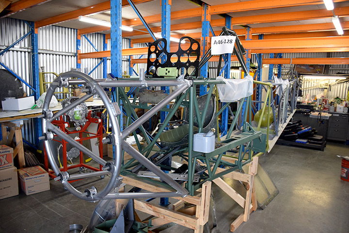 The fuselage frame sits on a rolling stand. (photo via AirCorps Aviation)The upper forward section from the rear of the cockpit to the firewall is shown here during the disassembly process. (photo via AirCorps Aviation)Here is a closer shot of the upper forward fuselage at the firewall end. (photo via AirCorps Aviation)The combat-veteran fuselage serves as a reference beside the fuselage fixture. (photo via AirCorps Aviation)