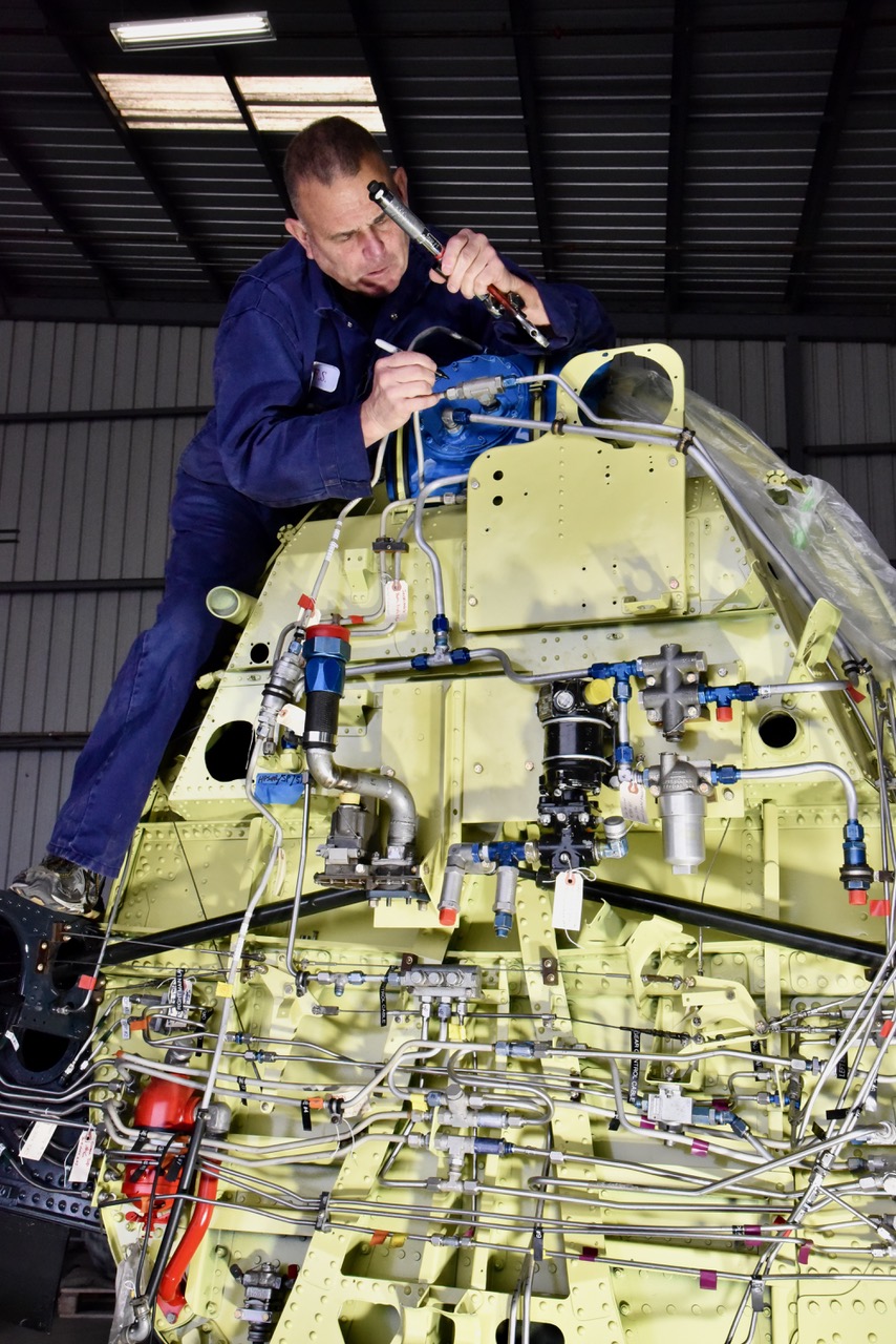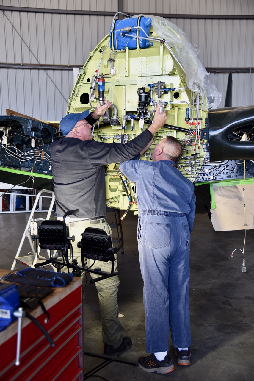 As with many restorations, the scope of work expanded as more issues came to light. “We had aileron linkage problems, wing fold lockdown problems—the list is massive,” McMahon said. “So we removed all the plumbing, replaced around 50% of the tubing, and completely overhauled all three landing gear legs.” The restoration is also a rare opportunity to make meaningful upgrades. “We’re repainting every square inch, inside and out,” he said. “That’s one reason for taking it all the way down—to gain access and bring it back as close to new as we can. I don’t have Red Bull money, but I have CAF money, and we can still bring it to a really nice status.” The cockpit is also being modernized, shedding outdated systems in favor of more reliable and serviceable components. “We’re going to install an electrically actuated Halon fire suppression system and remove any vacuum-driven gauges,” McMahon said. “We’ll be putting in an AV-30E system, updating the radios, the transponder, ADS-B—things that make the airplane safer and more supportable.”