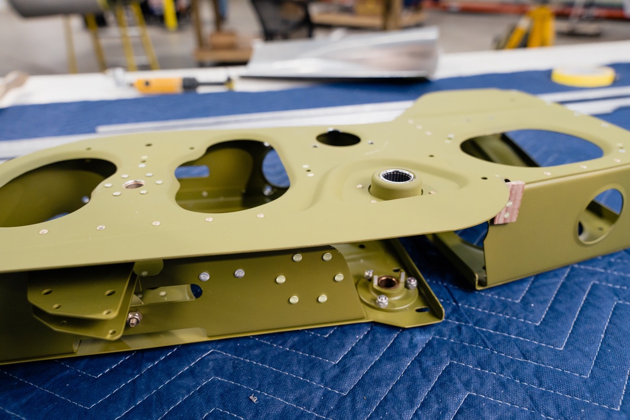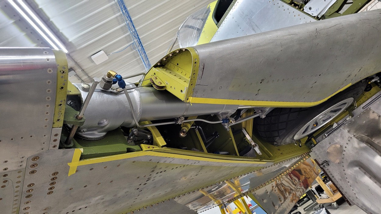 The upper end of the main landing gear strut is in place. The thin cables connect to the landing gear timing valve. (image via AirCorps Aviation)