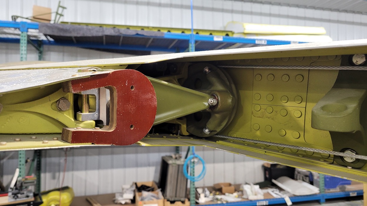 The olive drab pulley with aileron control cables encircling it is the outboard aileron pulley assembly. (image via AirCorps Aviation)