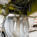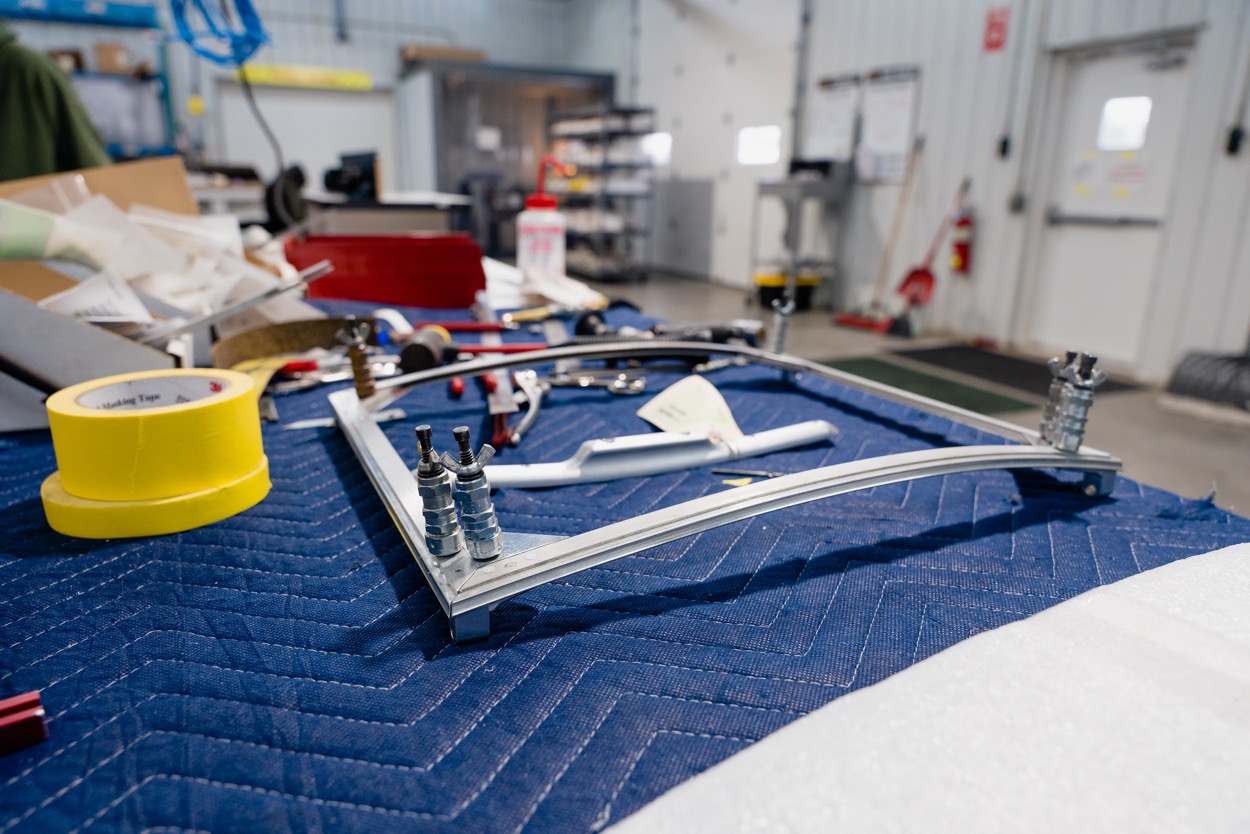 Fitting the windshield assembly and the rest of the cockpit enclosure is an exacting process. The aluminum frame structure needs to be fitted, and each window has to be trimmed precisely.