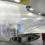 One of the areas which requires a lot of time in a Mustang restoration is the lower fuselage which comprises the air scoop, doghouse, radiator wrapper, and exit duct. These components house the radiator, oil cooler and exit door. Luckily, with Thunderbird, we had original parts for several of these major elements which required only minor restoration before we could fit them to the airframe.
